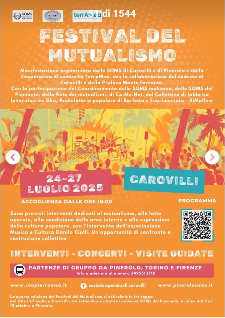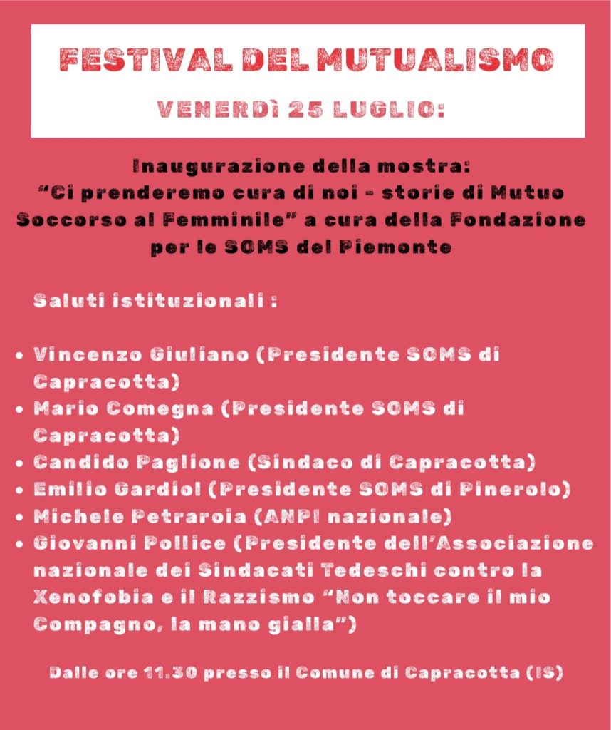 L’assessore comunale alla cultura di Capracotta, Pierino Di Tella, annuncia che «il festival del mutualismo quest’anno vedrà protagonista anche il Sud, con una serie di eventi che avranno luogo nella sede della Società Operaia Molisana di Carovilli dal 24 al 27 luglio». Proprio nell’ambito di questo festival, Capracotta – prosegue l’assessore Di Tella – «avrà l’onore di ospitare, dal 25 luglio e per tutto il mese di agosto, all’interno delle due società di mutuo soccorso, la mostra curata dalla fondazione per la Società Operaia di Mutuo Soccorso di Pinerolo dal titolo “Ci prenderemo cura di noi – storie di mutuo soccorso al femminile”».
