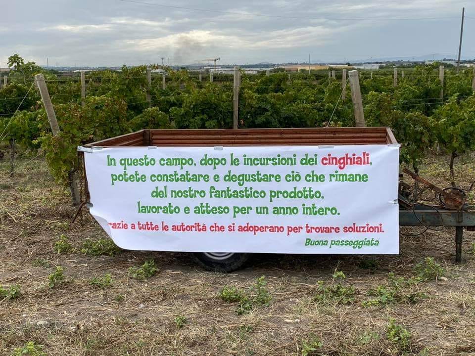 VASTO – «In questo campo, dopo le incursioni dei cinghiali, potete constatare e degustare ciò che rimane del nostro fantastico prodotto, lavorato e atteso per un anno intero. Grazie a tutte le autorità che si adoperano per trovare soluzioni. Buona passeggiata». È lo striscione affisso ai margini di un campo coltivato, più volte depredato dai cinghiali, all’interno del perimetro della riserva naturale regionale di Punta Aderci a Vasto. Una protesta, quella degli agricoltori vastesi, contro le istituzioni che tardano a trovare soluzioni efficaci al proliferare indisturbato dei cinghiali.