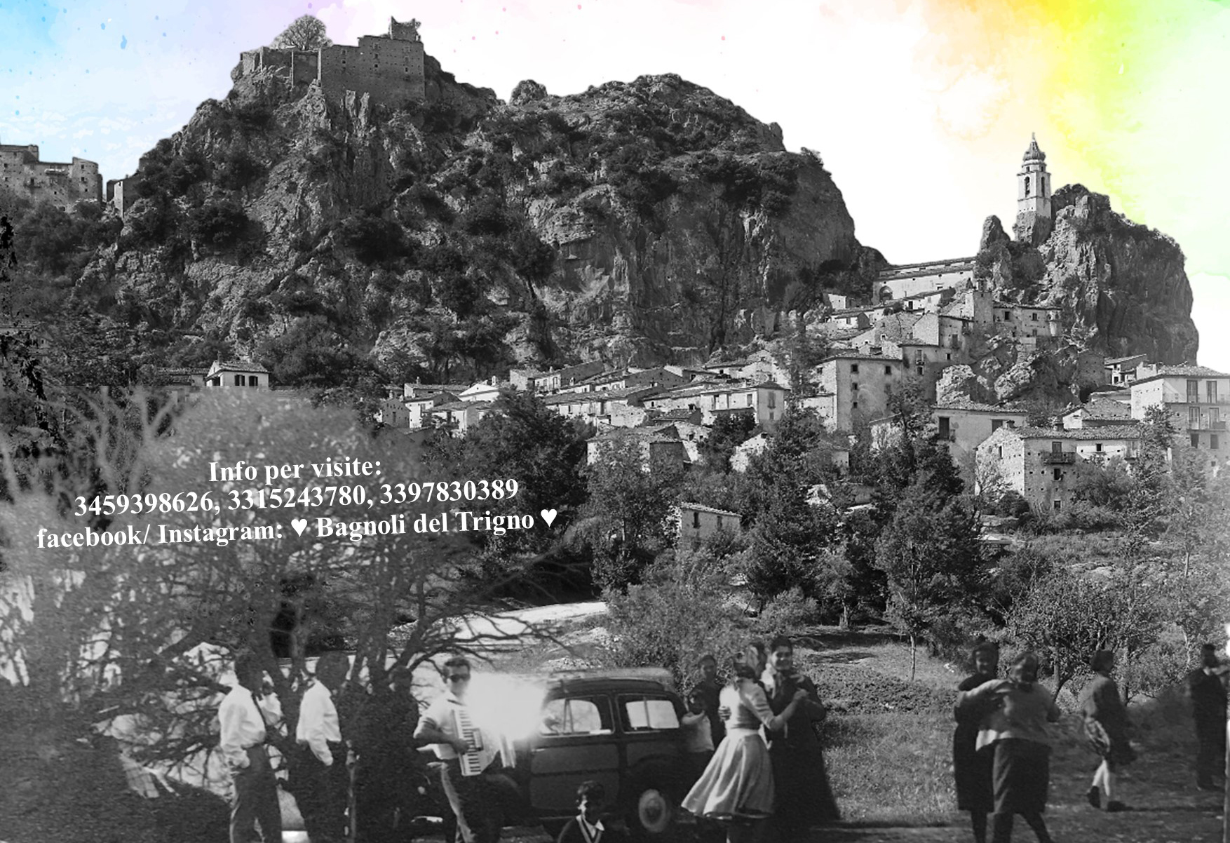 Per la locandina di presentazione di questa raccolta è stata scelta una foto del Gabinetto Fotografico Nazionale del 1926, quando sulla roccia di Bagnoli non c’erano i gradoni. In primo piano una foto di famiglia che mostra un gruppo di bagnolesi in festa. Sullo sfondo un’esplosione di colori contrasta con le foto in bianco e nero, a simboleggiare l’incontro delle potenzialità delle nuove tecnologie del futuro con dei pezzi del nostro passato da conservare. Il contrasto ricorda anche che alcuni valori del passato possono essere guida per nuove prospettive future.