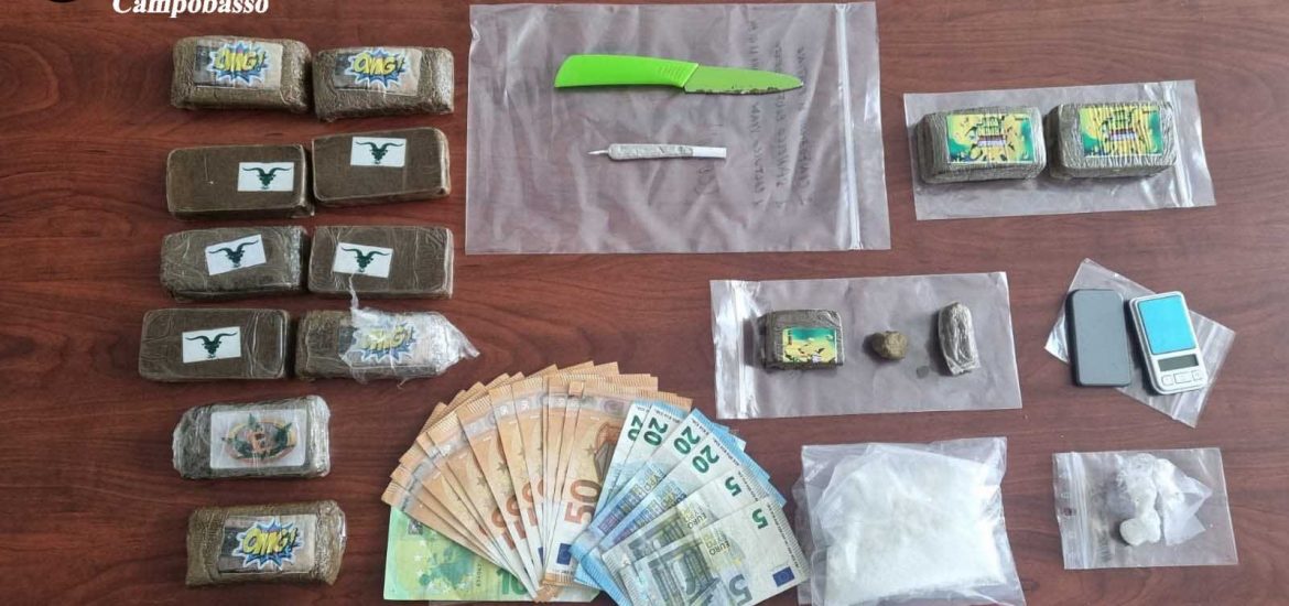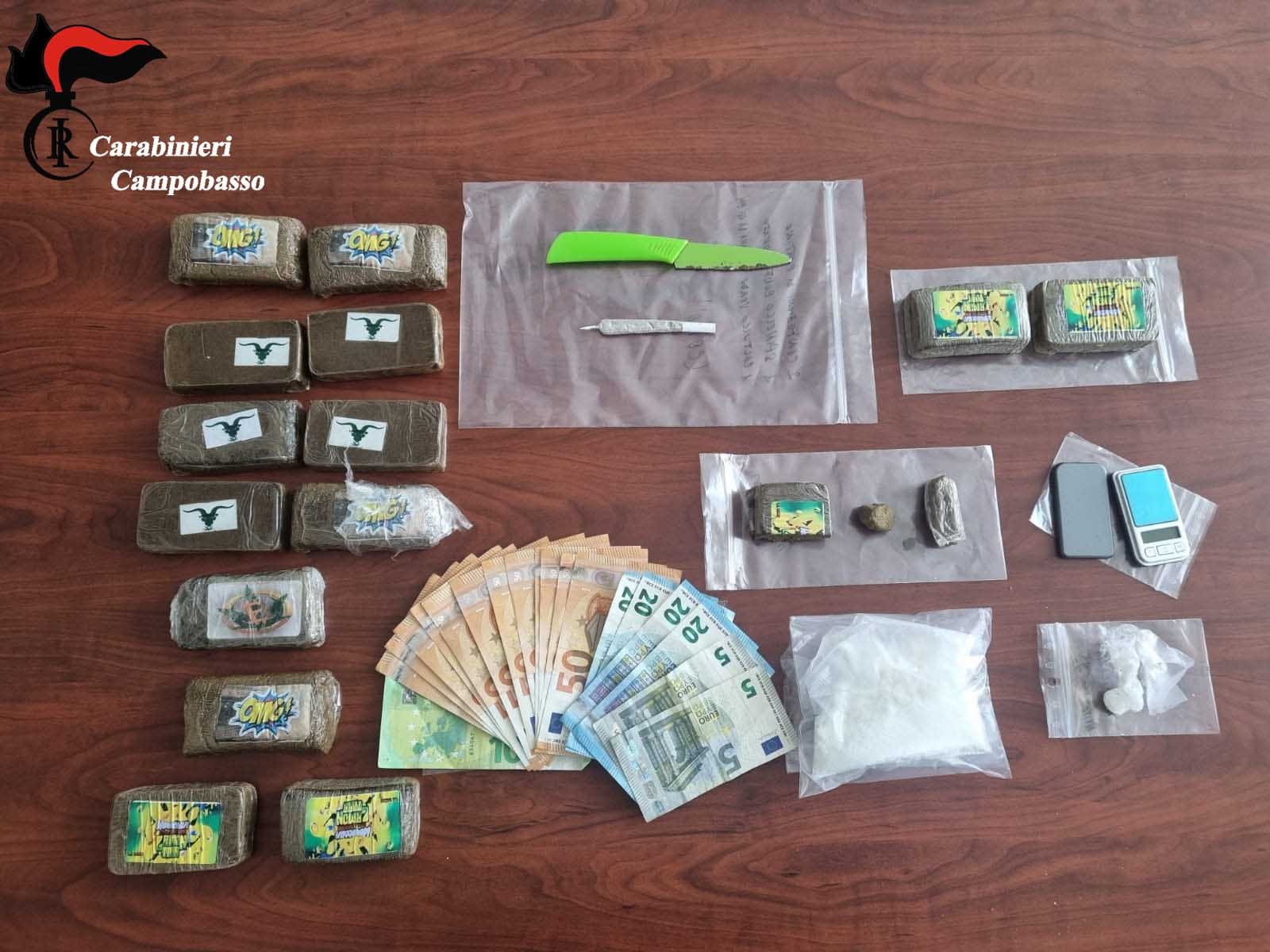 A quel punto i militari intervenivano tempestivamente, bloccando i due e procedendo ad effettuare una perquisizione domiciliare a carico dell’uomo, nel corso della quale rinvenivano 14 panetti di Hashish del peso totale di kg. 1,42 circa, 3 pezzi della medesima sostanza del peso complessivo di gr. 66,00, 2 involucri in cellophane contenenti Cocaina del peso totale di gr. 106,00, materiale vario per confezionamento di stupefacenti e 790,00 euro in contanti, verosimile provento di attività di spaccio. Quanto rinvenuto nel corso della citata attività di polizia giudiziaria veniva sottoposto a sequestro, in attesa delle analisi di laboratorio e del successivo deposito presso il competente Ufficio Corpi di Reato, mentre il 30enne – appurate le sue responsabilità penali in relazione al reato di spaccio e detenzione ai fini di spaccio di sostanze stupefacenti, previsto e punito dall’articolo 73 del D.P.R. 309/1990 – veniva tratto in arresto e tradotto presso la casa circondariale di Larino (CB), per ivi permanere a diposizione della Procura della Repubblica presso il Tribunale di Larino (CB).