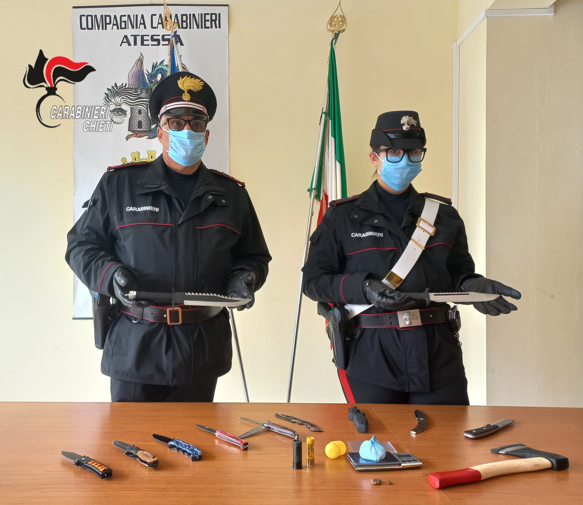 La successiva perquisizione domiciliare presso il domicilio di Atessa permetteva di rinvenire un bilancino elettronico di precisione e 1,2 grammi di sostanza stupefacente del tipo Hashish, ma soprattutto un ingente quantitativo di armi bianche, ben 11 coltelli ma anche due cartucce a pallini calibro 12. Coltelli di ogni genere e misura, da caccia, da sopravvivenza, a serramanico, da lancio, armi bianche che tuttavia l’uomo non poteva detenere in quanto nell’aprile 2009 era stato raggiunto da un provvedimento di divieto di detenzione armi emesso dal Prefetto di Chieti. Le armi e lo stupefacente sono state sequestrate.