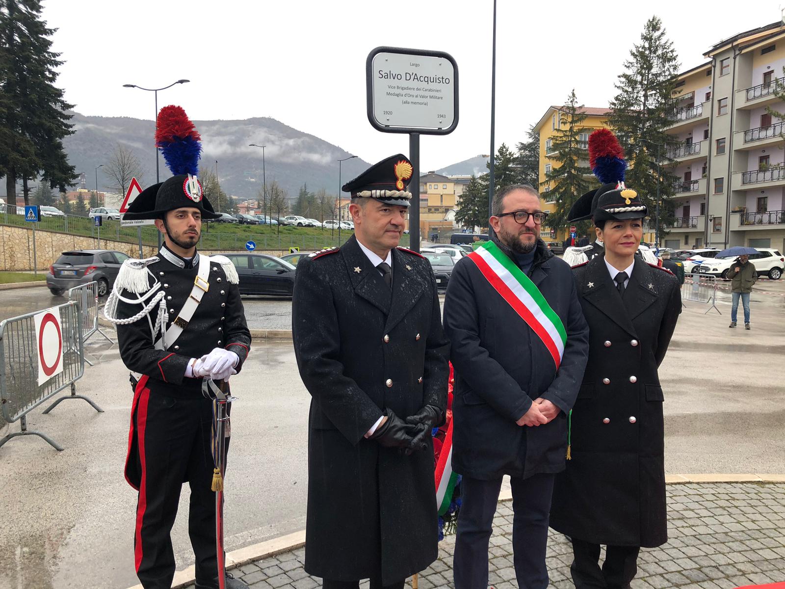 La cerimonia si è svolta presso lo slargo prospiciente la rotatoria tra viale della Croce Rossa, via Beato Cesidio e viale Corrado IV, alla presenza del sindaco dell’Aquila, Pierluigi Biondi, del comandante provinciale dei Carabinieri, col. Nicola Mirante, della pronipote del vicebrigadiere, il maggiore dell’Arma dei Carabinieri, Valentina D’Acquisto, in servizio presso lo Stato Maggiore di Roma, le autorità militari, civile e religiose, insieme alla partecipazione degli alunni della scuole secondarie “Dante Alighieri” e “Teofilo Patini”.