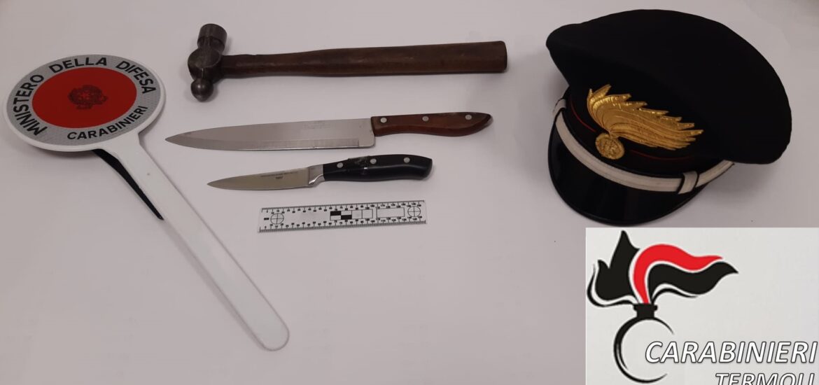Nel corso dei mirati servizi perlustrativi, in particolare, i Carabinieri della Sezione Radiomobile della Compagnia di Termoli hanno proceduto al controllo in centro abitato, un autocarro con alla guida un 57enne operaio originario del beneventano con precedenti di polizia. Lo stesso, al momento del controllo, appariva agitato e non in grado di giustificare la sua presenza sul posto; pertanto gli operanti decidevano di procedere a perquisizione personale e veicolare d’iniziativa, rinvenendo all’interno dell’abitacolo ed addosso all’uomo un martello e due coltelli a lama fissa di cui lo stesso non era in grado di giustificarne il porto.