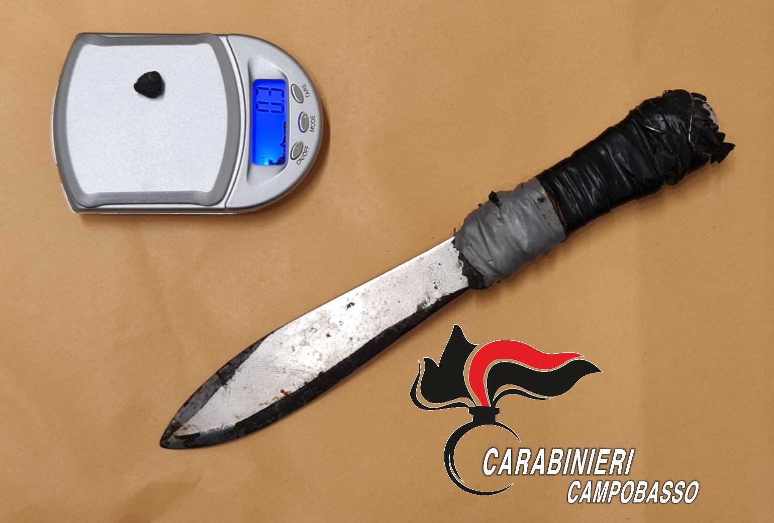 Un uomo della provincia di Isernia, ad un controllo stradale di una pattuglia dell’Aliquota Radiomobile nei pressi di Bojano, è stato trovato in possesso di un coltello artigianale di grandi dimensioni, occultato sotto al sedile e una esigua quantità di sostanza stupefacente del tipo “hashish”. L’uomo è stato deferito all’Autorità Giudiziaria per il possesso dell’arma e segnalato quale assuntore di sostanze stupefacenti con contestuale immediato ritiro del documento di guida.