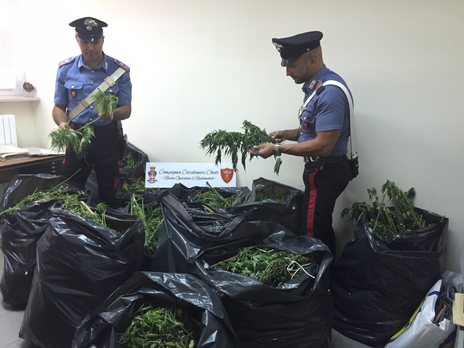 I Carabinieri del N.O.R. di Chieti, nel corso di specifici servizi predisposti per il contrasto ai reati in materia di stupefacenti, hanno tratto in arresto M.G. 53enne di Ortona, già noto alle forze di polizia, contestandogli il reato di coltivazione di piante contenenti sostanze stupefacenti. Nel corso di controlli estesi a largo raggio, i militari hanno proceduto ad una verifica presso l’abitazione del soggetto, già tratto in arresto per reati specifici nel 2012. Nel corso degli accertamenti, in un’area verde di pertinenza della villetta, sita nella periferia di Ortona, gli investigatori hanno individuato, tra gli ortaggi ed altre colture alimentari, ben 21 piante di Cannabis Indica, dell’altezza di circa 4 metri l’una, prossime alla maturazione ed alla raccolta. Il peso complessivo delle coltivazioni rinvenute e sequestrate è di circa 120 kg lordi, dalle quali poi sarebbe stato possibile ricavare, tra foglie ed infiorescenze, una percentuale stimata di circa il 10%, ovvero intorno ai 10 kg, di stupefacente commerciabile, per un valore di mercato quantificabile nell’ordine dei 25000 o 30000 euro. Le piante, nel giro di un paio di settimane sarebbero state pronte per la raccolta e la successiva vendita, ma l’intervento dei militari dell’Arma ha vanificato i progetti di guadagno di M.G., il quale invece si è ritrovato agli arresti domiciliari.