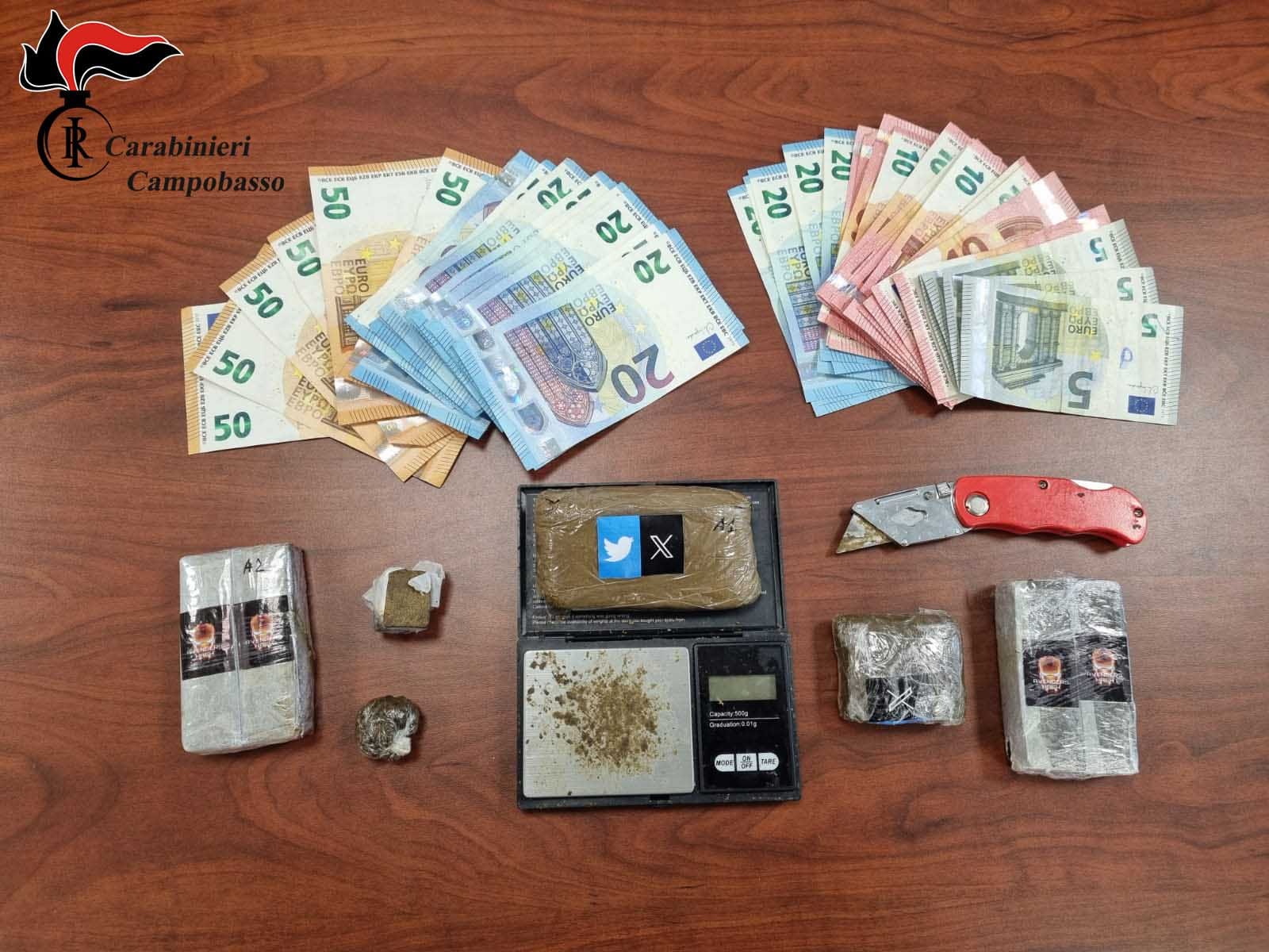 La successiva perquisizione domiciliare, effettuata presso l’abitazione di residenza del “pusher”, consentiva inoltre di trovare tre panetti e due pezzi di Hashish del peso complessivo di gr. 365,00 circa, un bilancino elettronico di precisione funzionante, materiale vario per il confezionamento di stupefacenti e 920 euro in banconote di vari tagli, verosimile provento di pregressa attività di spaccio.