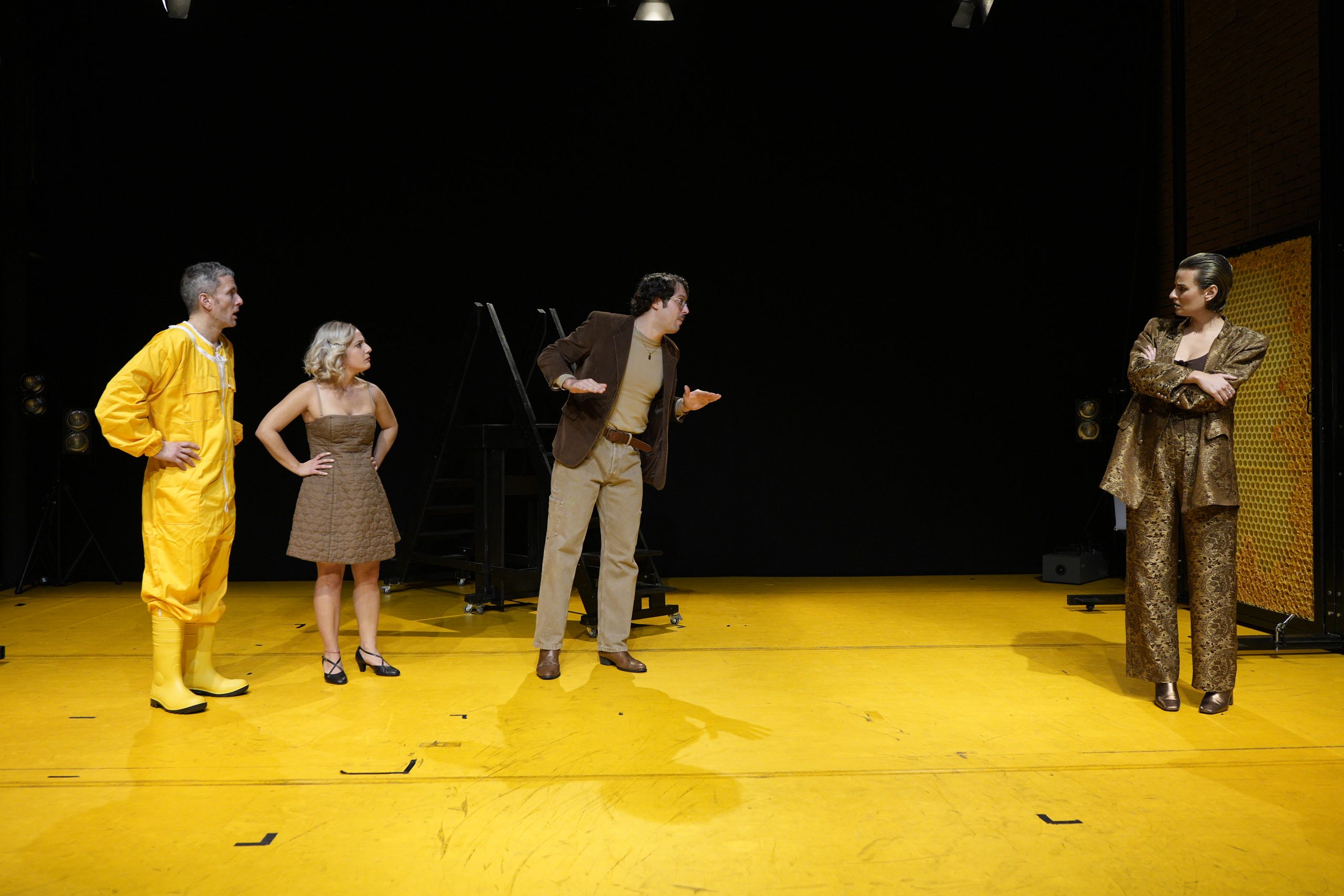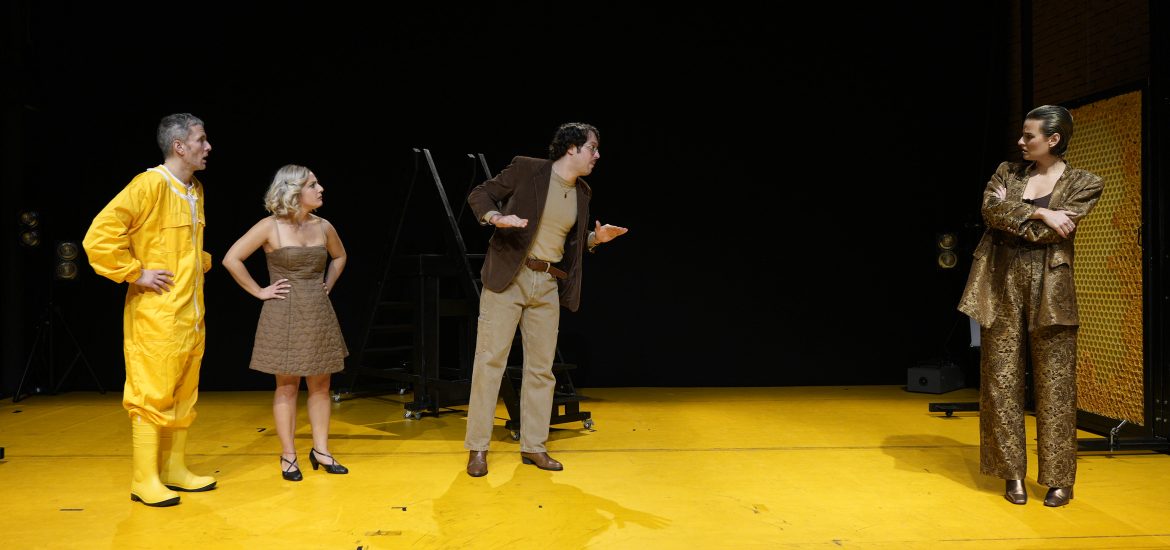 Gli attori Luca Mammoli, Serena De Siena, Tomas Leardini e Silvia Valsesia si muovono in una scena surreale, firmata da Francesco Fassone con la collaborazione di Jessica Koba, che assume i contorni di un gigantesco alveare. I costumi, altrettanto fuori dall’ordinario ma mai macchiettistici, sono disegnati da Costanza Maramotti con la collaborazione di Nuvia Valestri. A completare il ricco cast tecnico, Antonio Merola alle luci, Olimpia Fortuni ai movimenti, Giorgia Blancato al trucco, Micol Russo e Cristina Ugo alla realizzazione della maschera, Anna Resmini alle grafiche. L’ambiente sonoro è costruito da Riccardo Tesorini.