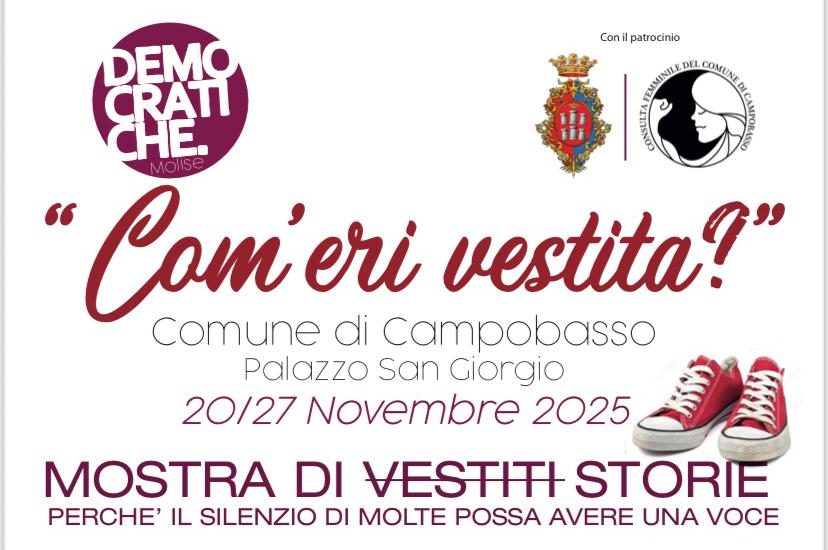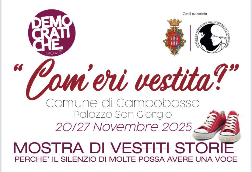Le Donne Dem del Molise, con il patrocinio del Comune di Campobasso e della Consulta Femminile comunale, promuovono la mostra “Com’eri vestita?”, che sarà inaugurata domani, giovedì 20 novembre alle ore 16.30, presso Palazzo San Giorgio.