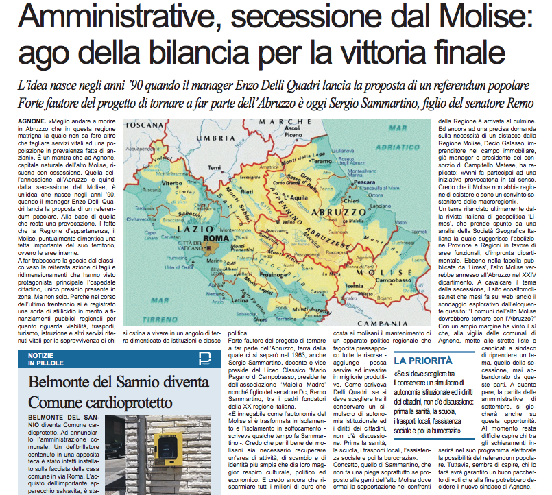“Meglio andare a morire in Abruzzo che in questa regione matrigna la quale non sa fare altro che tagliare servizi vitali ad una popolazione in prevalenza fatta di anziani”. E’ un mantra che ad Agnone, capitale naturale dell’alto Molise, risuona con ossessione. Quella dell’annessione all’Abruzzo e quindi dalla secessione dal Molise, è un’idea che nasce negli anni ’90, quando il manager Enzo Delli Quadri lancia la proposta di un referendum popolare. Alla base di quella che resta una provocazione, il fatto che la Regione d’appartenenza, il Molise, puntualmente dimentica una fetta importante del suo territorio, ovvero le aree interne.