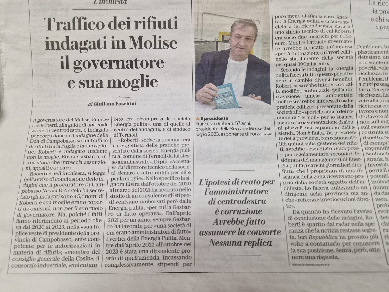 “La vicenda in questione non riguarda il mio ruolo da Presidente della Giunta Regionale del Molise ,è per attività precedenti alla mia elezione. Mi preme precisare come da parte mia ci siano stati sempre comportamenti corretti e rispettosi della legge”. Così il governatore del Molise Francesco Roberti a proposito del suo coinvolgimento nell’inchiesta della Direzione Distrettuale Antimafia di Campobasso.