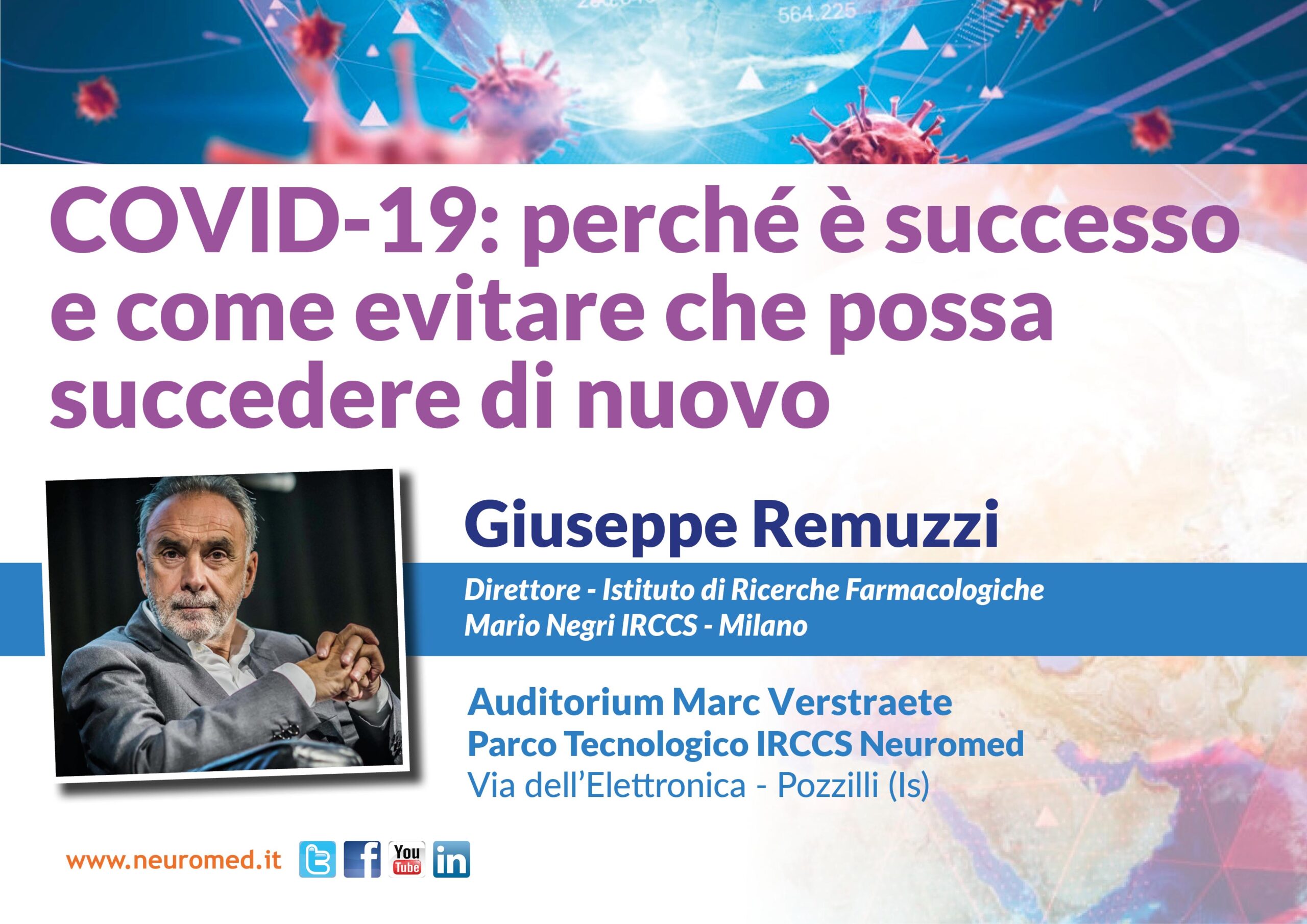 “Covid-19: perché è successo e come evitare che possa succedere di nuovo”. E questo il titolo della lettura magistrale che il professor Giuseppe Remuzzi, Direttore dell’Istituto Mario Negri di Milano terrà al Neuromed. L’incontro si terrà nel Centro ricerche dell’I.R.C.C.S., nella Sala Marc Verstraete, venerdì 1 luglio, alle ore 11:00.