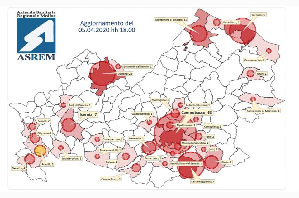 E sempre dalla mappa Asrem del contagio viene ulteriormente smentita la voce (da procurato allarme, ndr) secondo la quale ci fossero casi positivi in altri centri dell’Alto Molise, sempre collegati al cluster della residenza assistenziale di Agnone.