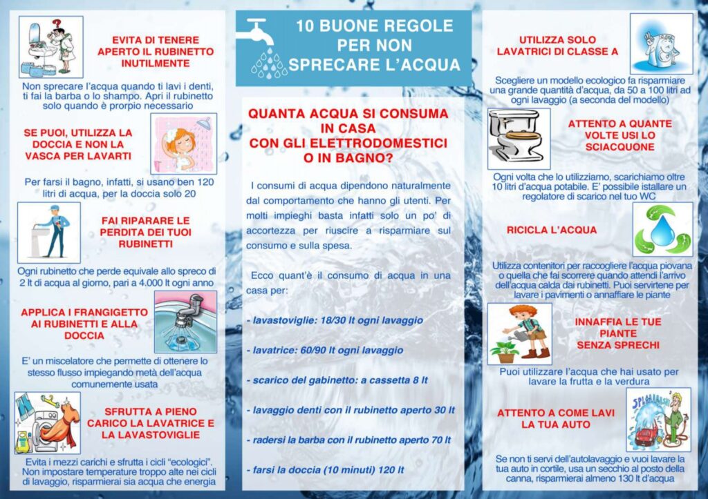 Sicuramente, ma forse recuperare quel 68 per cento di preziosa acqua che si disperde a causa di una rete idrica colabrodo sarebbe la priorità assoluta. «Il tema del risparmio idrico e su come risparmiare acqua in casa è molto importante in quanto l’acqua è uno dei beni primari della nostra vita. -insistono dal Municipio – Purtroppo non è inesauribile e per questo motivo va usata in modo intelligente. Ogni italiano, secondo l’Istat, consuma ogni giorno 245 litri d’acqua: con qualche piccolo accorgimento possiamo ottimizzare questa risorsa preziosa e sposare uno stile di vita più sano e sostenibile. L’acqua è un bene davvero prezioso. Cambia le tue abitudini quotidiane e inizia a risparmiarla. – chiudono dal Comune – Vi invitiamo a prendere visione dei nostri dieci consigli per risparmiare l’acqua e ridurre così anche i costi in bolletta». Le reti colabrodo posso attendere.