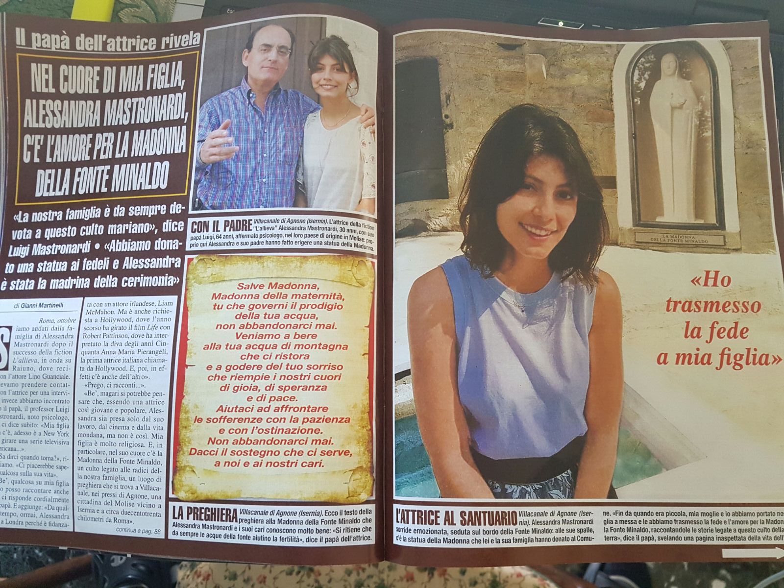 ROMA – Dopo il contatto con l’Eco de l’Alto Molise, il settimanale DiPiù, diretto da Sandro Mayer, dedica la copertina dell’ultimo numero all’attrice di origini agnonesi Alessandra Mastronardi. Un servizio speciale quello sulla Mastronardi che parla del suo rapporto con la religione ed in particolare con la Madonna di Fonte Minaldo di Villacanale, la frazione alle porte di Agnone. Una devozione che Alessandra, protagonista della fiction di Raiuno “L’allieva”, deve tutta al papà Luigi Mastronardi, 64 anni, psicologo e docente universitario.