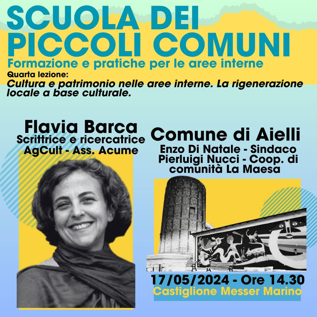 “Cultura e patrimonio nelle aree interne. La rigenerazione locale a base culturale” è infatti il titolo del quarto appuntamento della scuola diretta da Rossano Pazzagli dell’UniMoli, che avrà come ospite e relatrice Flavia Barca, scrittrice e ricercatrice esperta di economia dei media e della cultura. «La cultura nelle sue diverse accezioni – sostiene Barca – può rappresentare una leva primaria di ingaggio delle comunità, di attivazione di cittadinanza consapevole, di sperimentazione di nuovi modelli di pianificazione e di pratiche di coesione sociale, a partire dalla partecipazione, diventando così anche una questione di democrazia. La cultura – conclude la scrittrice – può essere driver di una trasformazione più inclusiva e capacitante nei processi di trasformazione e di rinascita delle aree interne italiane».