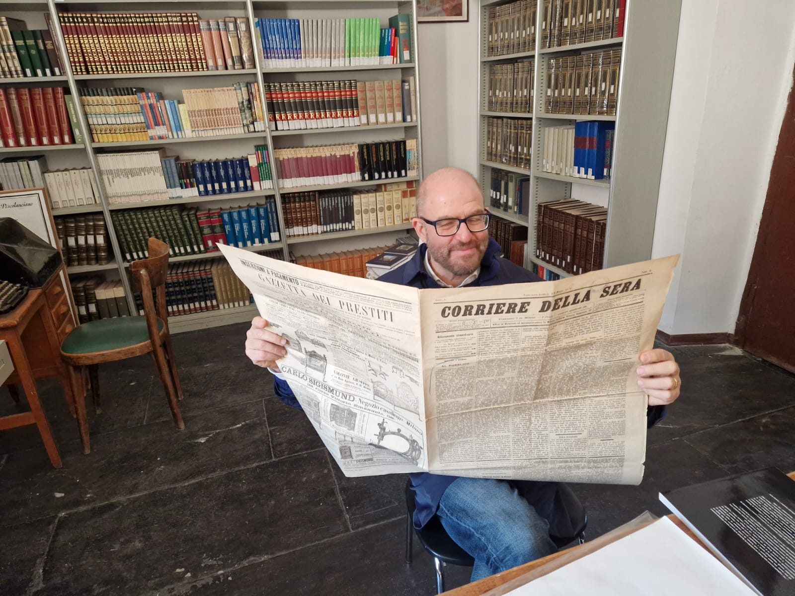 La scoperta è avvenuta durante una visita all’antica biblioteca comunale di Palazzo San Francesco, scrigno di volumi preziosi e sede dei suggestivi soffitti lignei francescani del XVII secolo. Lì, tra scaffali e memorie storiche, l’editorialista ha trovato traccia del numero uno dello storico quotidiano milanese, di cui fu co-fondatore l’agnonese Vincenzo Labanca, all’epoca corrispondente da Roma.