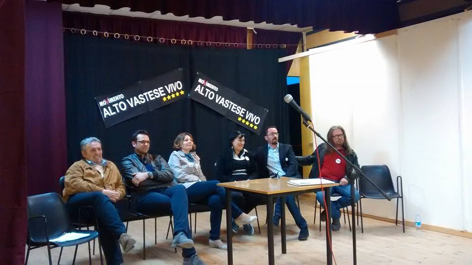 Così al telefono con la nostra redazione Daniela Aiuto, candidata alle europee con il Movimento 5 Stelle, che ha preso parte, questa sera, all’incontro elettorale a Celenza sul Trigno. Insieme a lei una nutrita delegazione di candidati alle regionali tra i quali Tiziano Torzi, presente già nelle scorse settimane a Torrebruna, sul fronte della frana di Guardiabruna, e ancora a Celenza per dibattere sulla delicata questione della soppressione della guardia medica e gli altri candidati Rema de Camillis, Antonio Lucifero, Silverio Marzocchetti, Pietro Smargiassi, Francesco Taglieri. Molti gli attivisti di zona intervenuti, come il candidato consigliere a Schiavi di Abruzzo, Luca Ninni (in foto insieme a Daniela Aiuto, ndr).