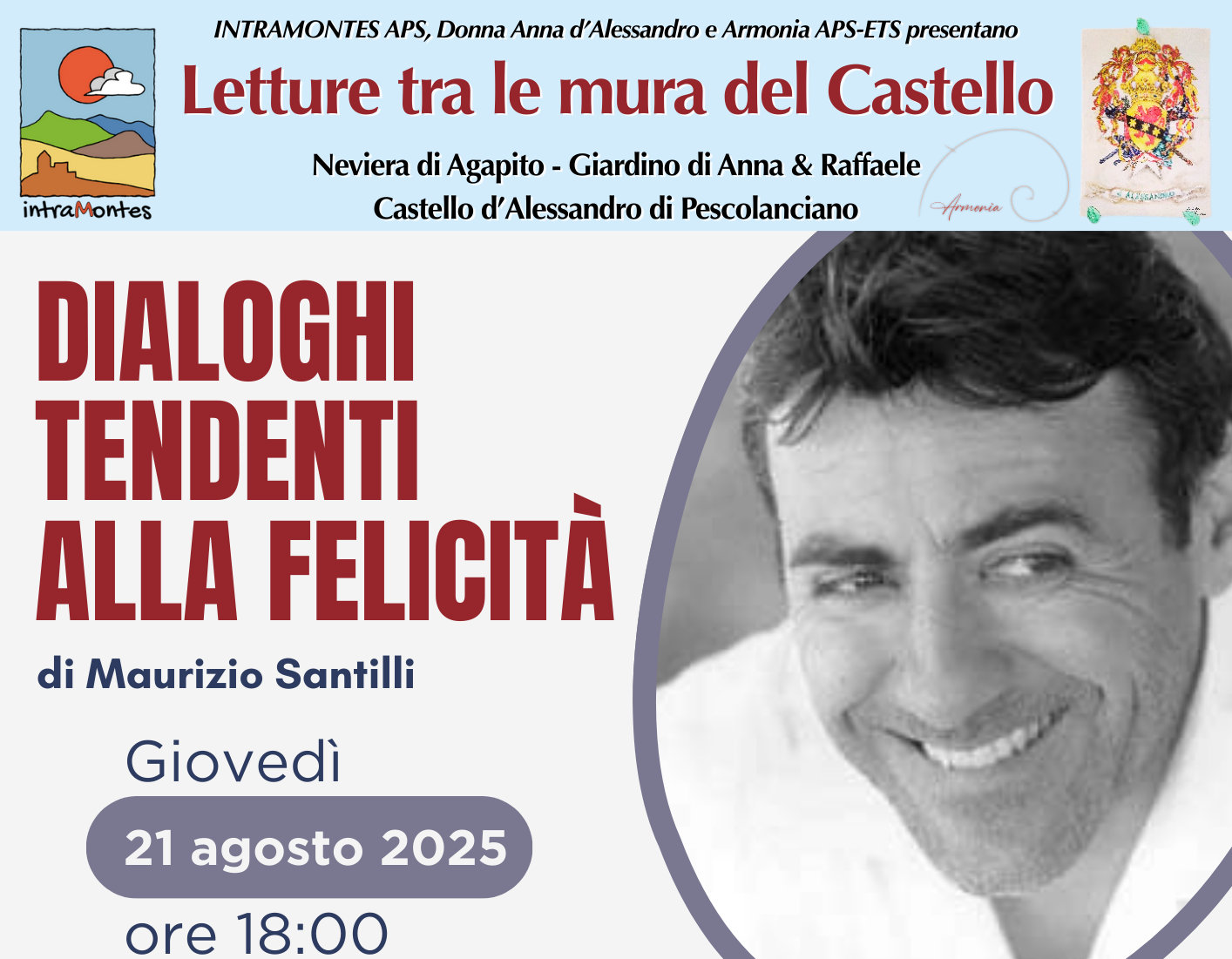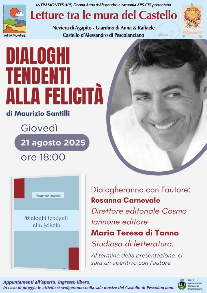 La rassegna si concluderà in bellezza domani, giovedì 21 agosto, alle ore 18 con la presentazione del libro “Dialoghi tendenti alla felicità” di Maurizio Santilli. Celebre attore molisano, Maurizio Santilli ha recitato al fianco di importanti personaggi del cinema italiano. Dialogheranno con lui la direttrice editoriale della Cosmo Iannone Editore, Rosanna Carnevale, e la studiosa di letteratura, Maria Teresa di Tanna. Gli appuntamenti sono a ingresso libero e si svolgeranno all’aperto, nella suggestiva Neviera di Agapito. In caso di maltempo, gli eventi si sposteranno all’interno delle sale espositive del Castello di Pescolanciano. L’evento è patrocinato dal Comune di Pescolanciano.