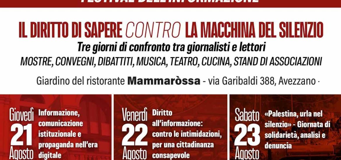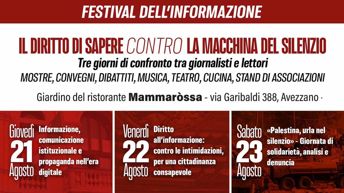«Non è un festival riservato agli addetti ai lavori: è un evento aperto a tutti, pensato per chi vuole capire cosa si cela dietro le notizie che non arrivano. Operatori del mondo dell’informazione e lettori discuteranno insieme di comunicazione istituzionale ridotta a propaganda, di amministrazioni locali che usano i social come fabbrica del consenso, dell’accesso negato alle informazioni pubbliche, delle querele intimidatorie e delle minacce ai cronisti» spiegano gli organizzatori.