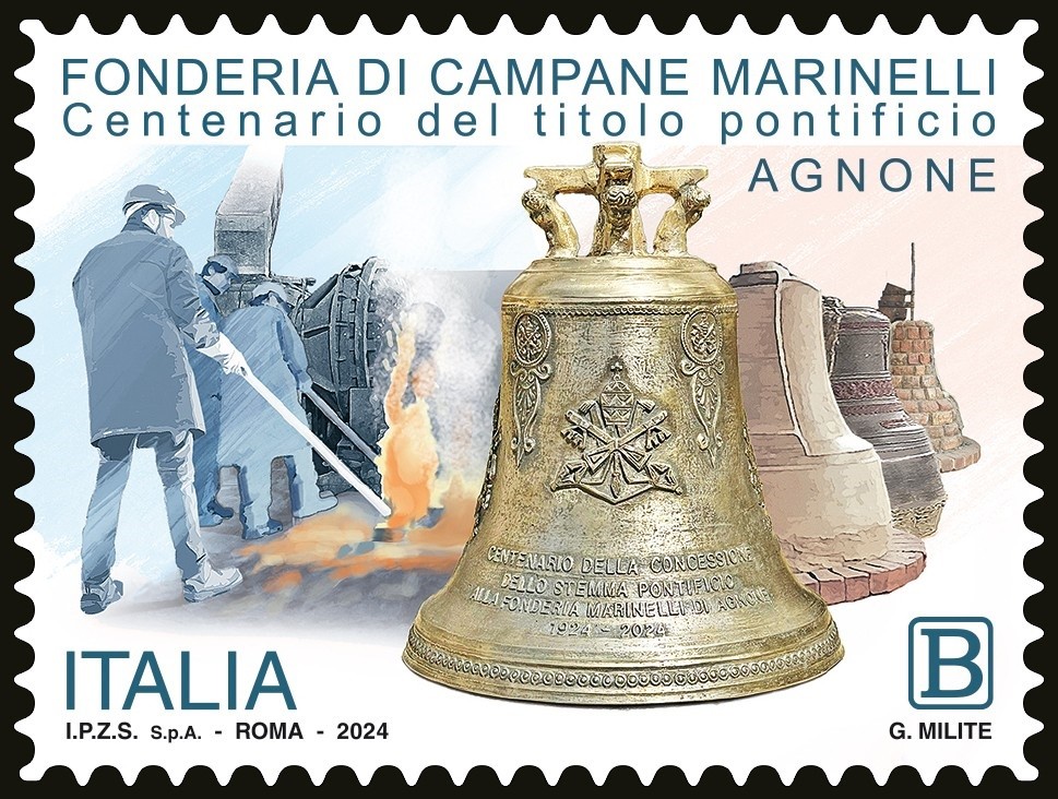 Tra le emissioni del 2024, anche i francobollo ordinario dedicato alla Fonderia di Campane Marinelli, emesso lo scorso 17 ottobre dal Ministero delle Imprese e del Made in Italy nel centenario della concessione del titolo pontificio e appartiene alla serie tematica “le Eccellenze del sistema produttivo ed economico” dedicata all’imprenditoria italiana.
