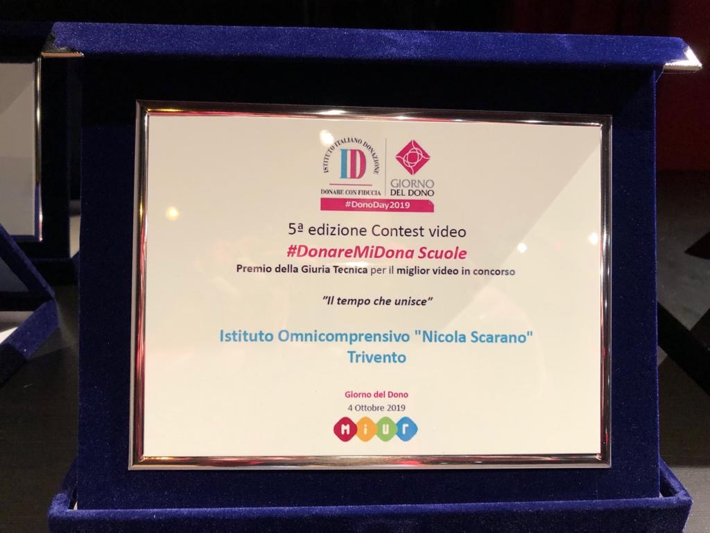 TRIVENTO – Grandissima emozione all’Istituto Omnicomprensivo di Trivento: la classe prima C, anno scolastico 2018-2019, oggi seconda B, è stata insignita di un importante riconoscimento, il primo premio giuria tecnica, del video contest nazionale #DonareMiDona scuole promosso dall’Istituto Italiano della donazione, nell’ambito delle iniziative del giorno del DONO.