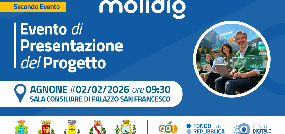 Sperimentare ed apprendere l’utilizzo delle nuove tecnologie digitali per l’inclusione sociale e per favorire l’ingresso nel mondo del lavoro. Il Comune di Agnone invita giovani e famiglie a partecipare all’incontro in programma nell’ambito del progetto “Molidig – Molise Digitale”, iniziativa finanziata dal fondo per la Repubblica Digitale Impresa Sociale nell’ambito dell’avviso “Dritti al Punto”, dedicata all’alfabetizzazione digitale e all’uso consapevole delle tecnologie connesse al web e all’intelligenza artificiale. L’evento, in programma lunedì 2 febbraio 2026, dalle ore 09:30 alle ore 12:30, nella Sala Consiliare di Palazzo San Francesco ad Agnone, è rivolto specificamente a studenti dai 16 anni in su, studenti universitari, laureati e giovani NEET (Neither in Employment nor in Education or Training) fino all’età di 34 anni, insieme alle loro famiglie.