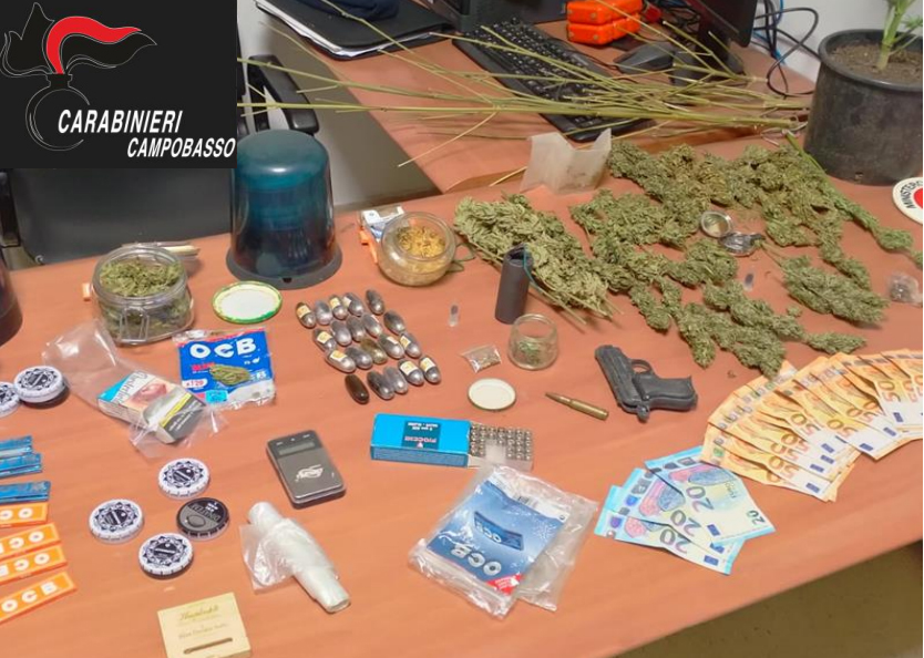 di circa mezzo chilo di sostanze stupefacenti tra hashish e marijuana nonché materiale per la pesatura ed il confezionamento dello stesso. Oltre allo stupefacente i militari hanno rinvenuto nella disponibilità del soggetto munizionamento da guerra, un ordigno esplosivo artigianale, due lampeggianti solitamente utilizzati dalle Forze di Polizia e documenti di riconoscimento risultati rubati. Per questo motivo su disposizione della Procura di Campobasso l’uomo è stato tradotto in carcere in attesa del giudizio di convalida.