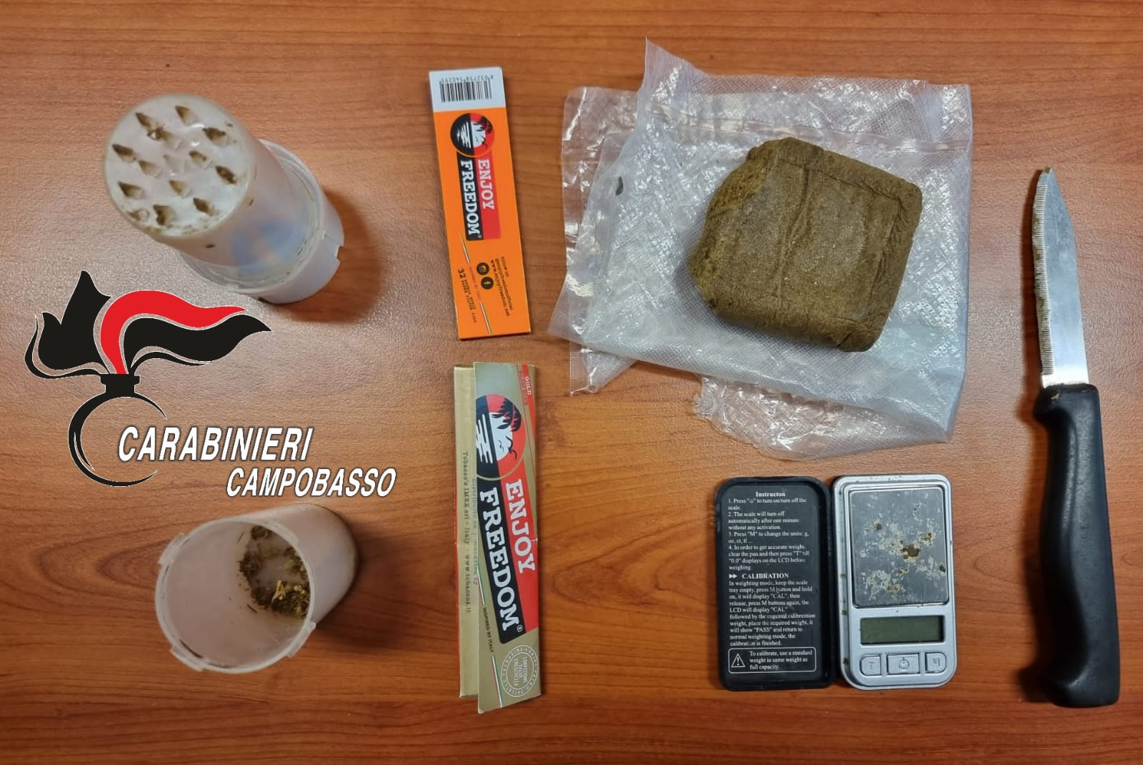 Il controllo del mezzo e degli occupanti, da subito, non lascia spazio a dubbi, infatti l’odore che proveniva dall’abitacolo era ineludibilmente quello dell’hashish, motivo per il quale si procede nell’immediatezza ad una ispezione che consente di rinvenire un bilancino di precisione ancora acceso, un grinder (classico trita marijuana) e un coltellino con la lama sporca di sostanza resinosa di colore marrone. Ai militari il quadro è chiaro, non si può escludere che gli occupanti del veicolo, tutti e tre minorenni, stessero suddividendo sostanza per i ragazzi poi fuggiti.