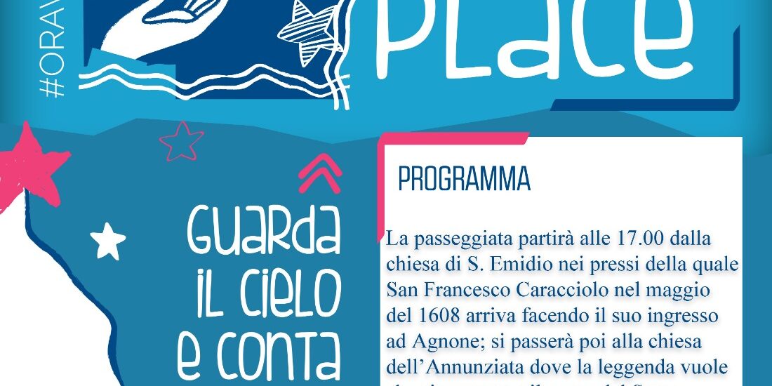 L’evento partirà alle 17 dalla chiesa di S. Emidio (punto di raccolta gruppo -Largo Pietro Micca, di fronte alla Proloco) nei pressi della quale San Francesco Caracciolo nel maggio del 1608 arriva facendo il suo ingresso ad Agnone; si passerà poi alla chiesa dell’Annunziata dove la leggenda vuole che sia nascosto il cuore del Santo. L’ultima tappa è prevista presso l’adiacente Convento dei Filippini dove è allestita la mostra-percorso “il Principe Mendicante” dedicata al Santo che proprio qui mori pronunciando le parole “Andiamo, andiamo al cielo”!