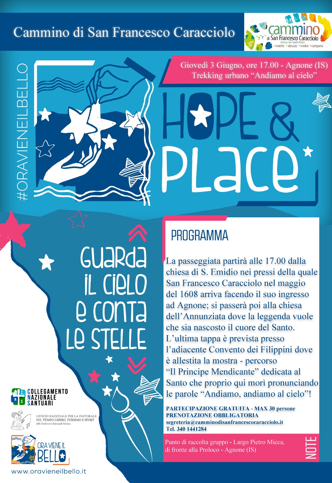 Il Cammino di San Francesco Caracciolo partecipa a “Ora Viene il Bello”, il contenitore proposto dall’Ufficio Nazionale Pastorale del tempo libero, turismo e sport della Conferenza Episcopale italiana per rispondere alla ripresa post pandemia e per creare esperienze generative nell’ambito del turismo e dell’ospitalità religiosi, dei pellegrinaggi e dei cammini di fede, (ogni giovedì fino al 13 settembre sarà possibile partecipare in tutta Italia alle iniziative organizzate, per il programma completo vedi qui https://turismo.chiesacattolica.it/oravieneilbello ) e propone giovedì 3 giugno alle 17.00 l’esperienza “hope&place” con il trekking urbano “Andiamo al cielo”.