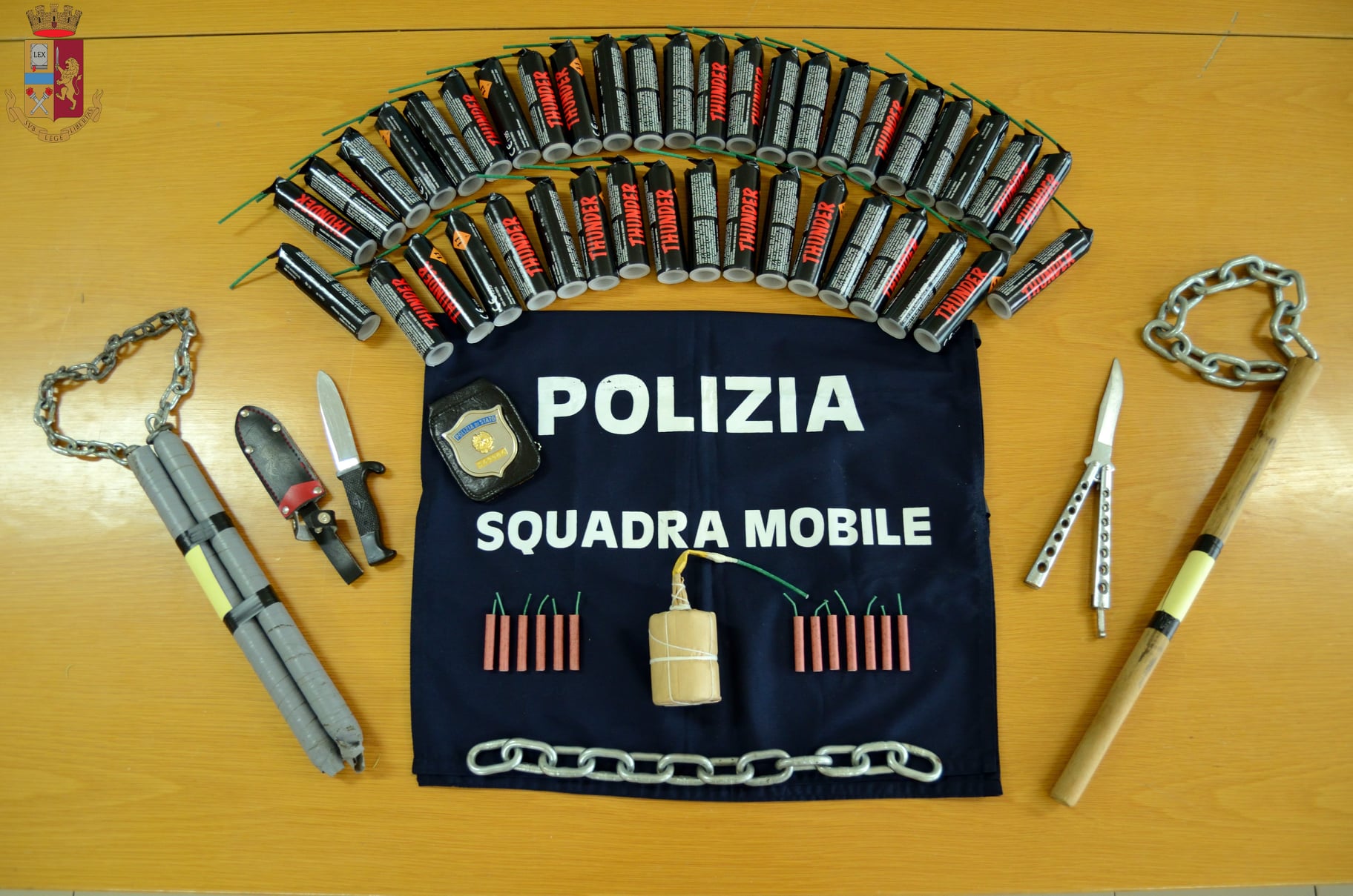 MATERIALE SEQUESTRATO A SEGUITO DI PERQUISIZIONE DOMICILIARE NEI CONFRONTI DEL SOGGETTO ARRESTATO: 1 manufatto esplosivo artigianale del peso di circa 200 grammi (risultato compatibile con quello fatto esplodere in data 05.06.2021 presso l’abitazione di un soggetto posto agli arresti domiciliari), 41 candelotti di tipo “Thunder” (la cui detenzione è consentita solo a chi è munito di apposita licenza), 13 petardi, il tutto per un peso complessivo di circa 2300 grammi di esplosivo. Sono state, inoltre, rinvenute 2 mazze ferrate, 2 coltelli (rispettivamente di 23 cm e di 20 cm), 1 “Nunchaku” collegato ad una catena di ferro.