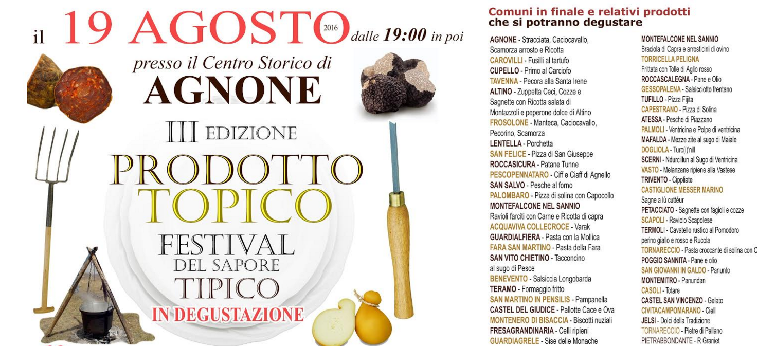 AGNONE – Cinquantotto comuni di sei regioni (Molise, Marche, Abruzzo, Campania, Basilicata, Calabria) pronti a darsi battaglia a colpi di prodotti enogastronomici. Location, il corso principale dell’Atene del Sannio, che questa sera, a partire dalle 19,00, ospiterà la terza finale del prodotto topico. A decidere chi si aggiudicherà la manifestazione (uno per ogni categoria: primi piatti, secondi, dolci-frutta e gelato) un comitato scientifico. Prima dell’inizio della finale, i sindaci dei 58 comuni saranno accolti in piazza Plebiscito (17,30) dagli organizzatori e l’amministrazione comunale con in testa il primo cittadino, Lorenzo Marcovecchio.