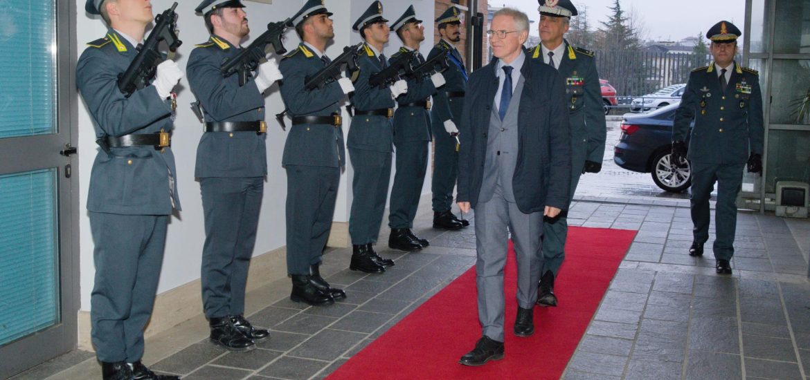 Il Prefetto Vito Cusumano ha fatto visita, nella giornata del 28 gennaio, al Comando Regionale Abruzzo della Guardia di Finanza dove è stato accolto dal Comandante Regionale, Generale di Brigata Fabio Massimo Mendella, dal Capo di Stato Maggiore Colonnello Roberto Di Mascio e dal Comandante Provinciale, Colonnello Pierfrancesco Oriolo, e dagli Ufficiali presenti alla sede e dai Comandanti dei Reparti della Provincia di L’Aquila.