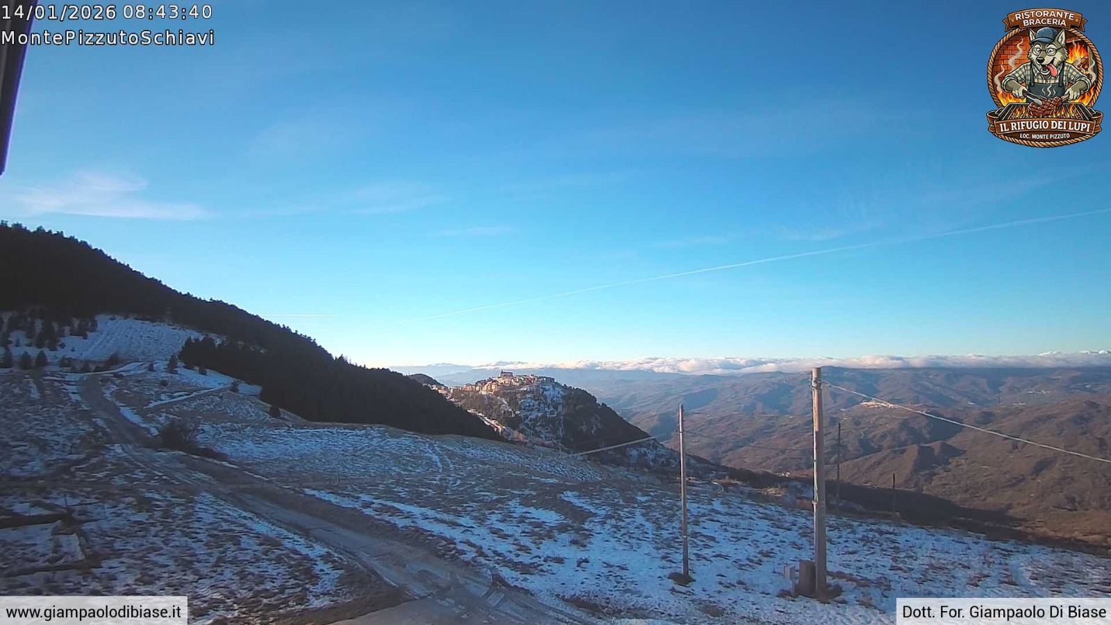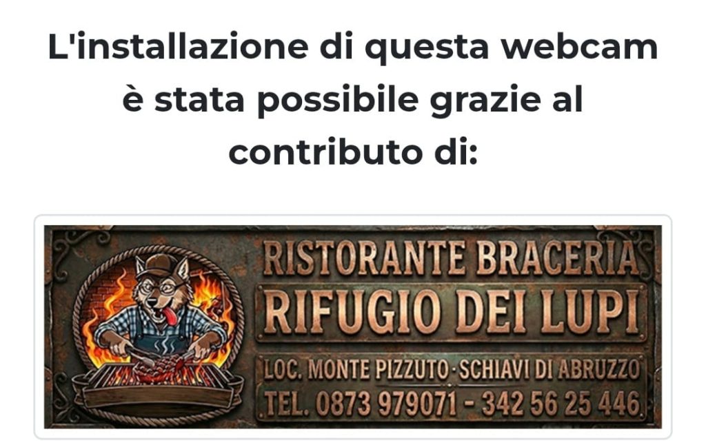 Altra chicca tecnologica firmata Giampaolo Di Biase e Antonello Pinnella a Schiavi di Abruzzo. Da qualche ora sul sito www.giampaolodibiase.it è attiva una nuova finestra digitale dall’Alto Vastese, che sarebbe meglio chiamare Alto Sannio. La nuova webcam è stata installata grazie alla disponibilità e al contributo del “Il Rifugio Dei Lupi“, noto ristorante e braceria di Roberto Amicone, ai piedi (1190 mslm) del Monte Pizzuto (1290 mslm) a Schiavi di Abruzzo (CH).