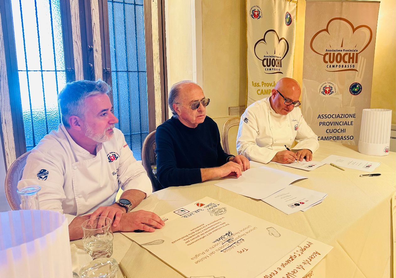 Una formazione di livello per i giovani per assicurare loro nuove opportunità nel settore della ristorazione. E’ l’obiettivo dell’accordo firmato oggi, nel ristorante “Svevia” del Borgo Antico di Termoli, dall’Azienda Autonoma di Soggiorno e Turismo del Molise con il Presidente dell’Unione Italiana Cuochi della Puglia Salvatore Turturo e dell’Unione Italiana Cuochi del Molise Massimo Talia che ha ospitato la conferenza nel locale del centro storico. Presenti i responsabili provinciali di Campobasso Matteo Miucci e di Isernia Giovanni Colarusso.