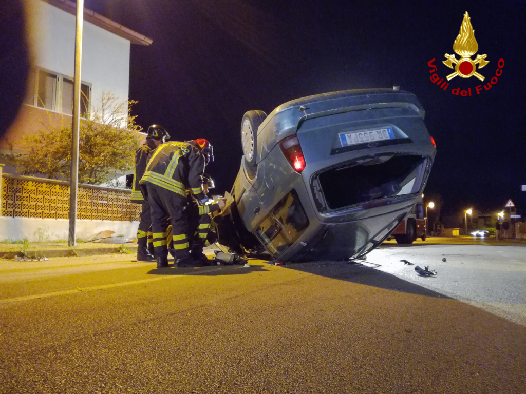 Auto si ribalta, conducente intrappolato messo in salvo dai Vigili del fuoco.