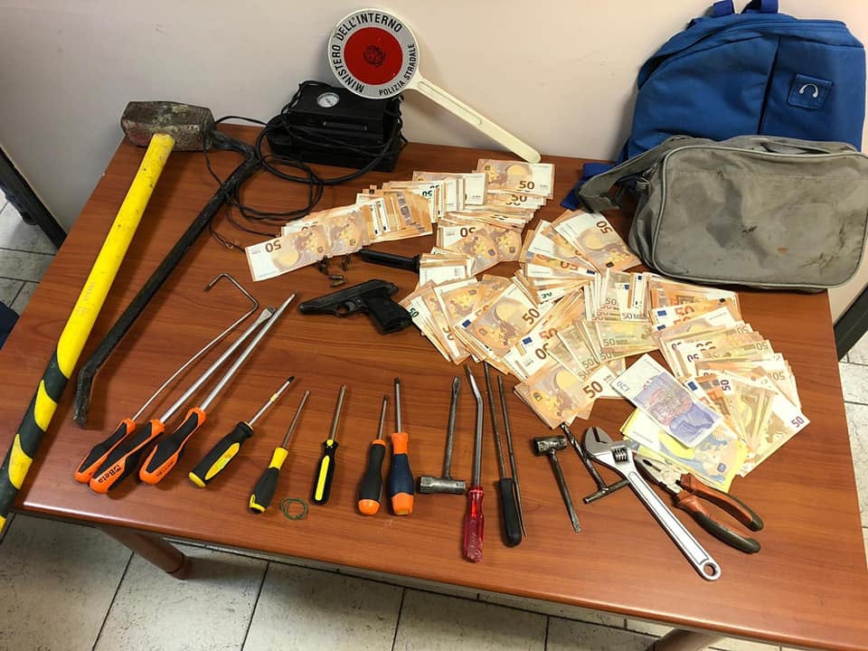 I tre soggetti erano inoltre in possesso di diversi attrezzi atti allo scasso e di una pistola calibro 7,65, carica, risultata rubata un mese prima a Carinola (CE).