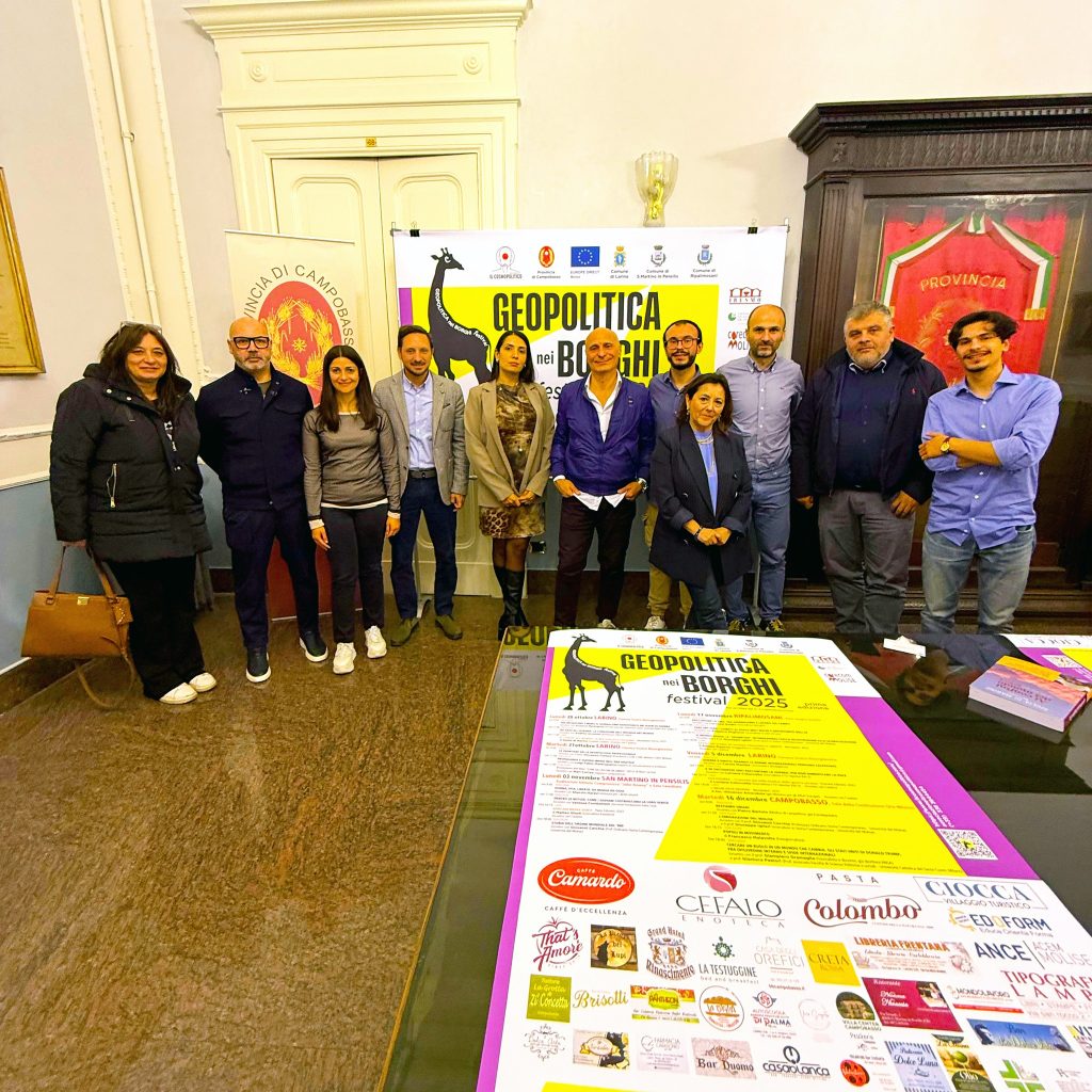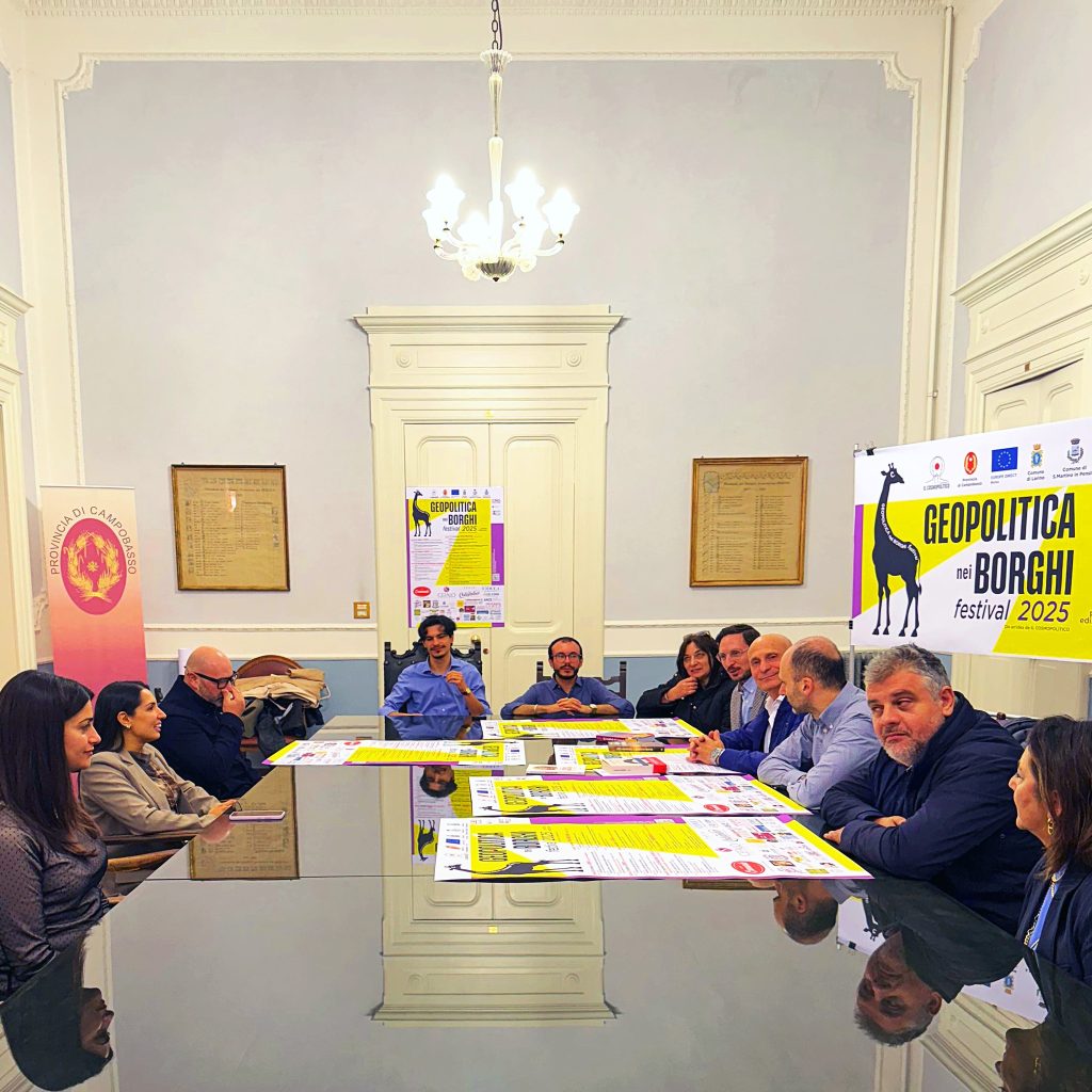 Nella Sala della Giunta della Provincia di Campobasso, l’Associazione Il Cosmopolitico ETS, in presenza del consigliere provinciale delegato alla scuola, Antonio Tomassone, in rappresentanza del presidente della provincia Giuseppe Puchetti, la responsabile di Europe Contact Molise, Carmela Basile, il presidente dell’ODG Molise e del CO.RE.COM Molise, Vincenzo Cimino, il sindaco di Ripalimosani, Marco Giampaolo, l’assessore alla cultura di San Martino in Pensilis, Mara Montanaro, ha presentato il calendario di “GEOPOLITICA NEI BORGHI festival 2025” I edizione, un Festival di Geopolitica itinerante in Molise che prenderà il via il 20 ottobre fino al 16 dicembre 2025.