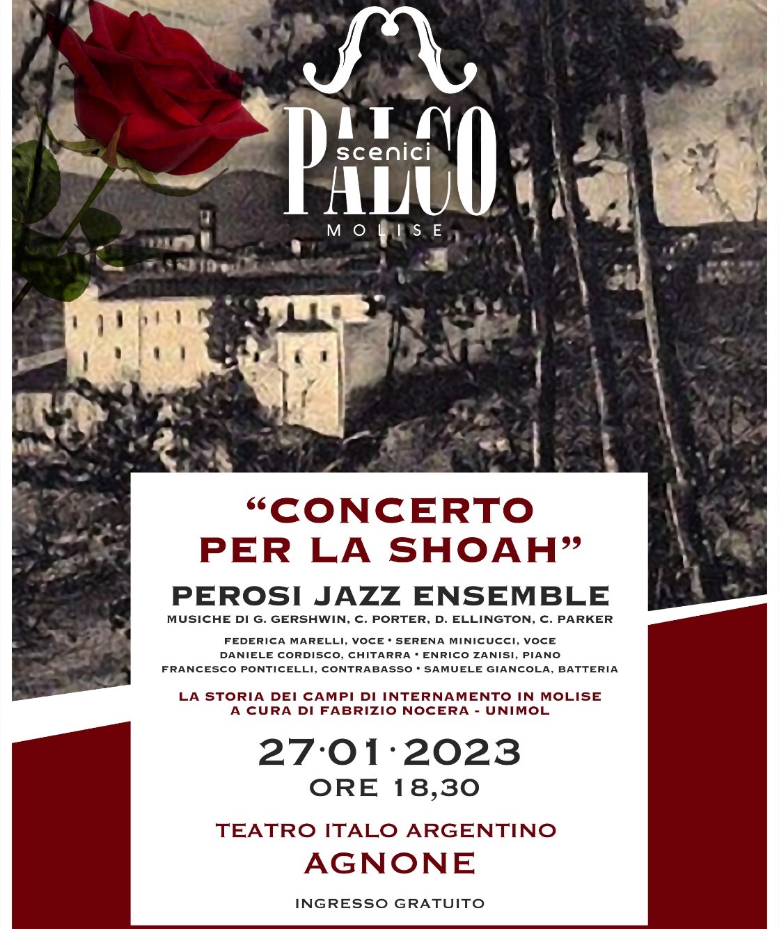 La musica “degenerata”, il Jazz, banditi dai regimi nazi-fascista, suonerà forte al teatro Italo-Argentino di Agnone per celebrare la Giornata della Memoria in ricordo di tutte le vittime dell’olocausto. Organizzato dall’Assessorato regionale alla Cultura, in collaborazione con il Conservatorio “Perosi”, il concerto andrà in scena ad Agnone, sede di uno dei cinque campi di internamento molisani, l’ex convento di San Bernardino da Siena, che subì l’onta delle leggi razziali con la repressione di centinaia di ebrei stranieri, sudditi nemici e rom della ex Jugoslavia.