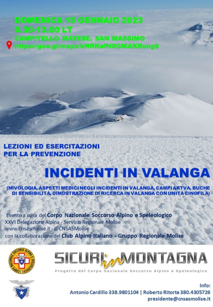 Il 15 gennaio 2023, dalle ore 09:30, in località Campitello Matese – San Massimo, il Corpo Nazionale Soccorso Alpino e Speleologico (CNSAS) organizza la giornata nazionale di “Sicuri con la neve”. L’evento si inserisce nel progetto nazionale del CNSAS “Sicuri in Montagna” (www.sicurinmontagna.it), ed ha lo scopo, in collaborazione con il Club Alpino Italiano, di promuovere e divulgare la sensibilizzazione verso la prevenzione degli incidenti in montagna, in primo luogo quelli causati da valanghe. Da sempre il CNSAS si fa promotore di questa opera di sensibilizzazione verso le problematiche inerenti la sicurezza in ambiente montano, in particolar modo per uno dei più complessi scenari di soccorso in montagna quale è quello delle valanghe.