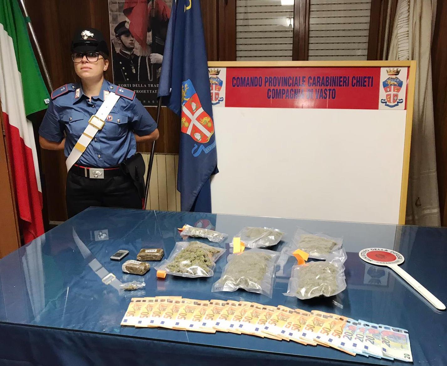 Il giovane, resosi conto della presenza dei Carabinieri cercava di dileguarsi per le vie di Vasto Marina. Raggiunto dopo poche centinaia di metri veniva sottoposto a perquisizione personale e trovato in possesso di grammi 18 di marijuana e 100 di hashish, oltre alla somma in contanti di euro 930 ritenuta provento di attività di cessione a terzi.