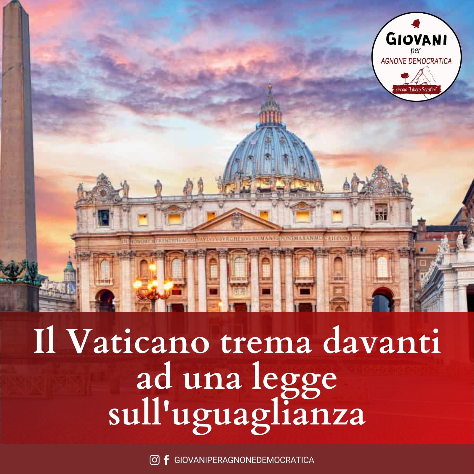 «Il Vaticano trema davanti ad una legge sull’uguaglianza». E’ l’accusa scagliata contro la Chiesa cattolica dal movimento politico giovanile vicino all’amministrazione Saia, i “Giovani per Agnone Democratica“. I giovani Dem di Agnone, da sempre attenti alla tutela dei diritti delle minoranze, escono pubblicamente, senza peli sulla lingua, sulla questione del momento, incrociando la spada della dialettica con don Francesco Martino.