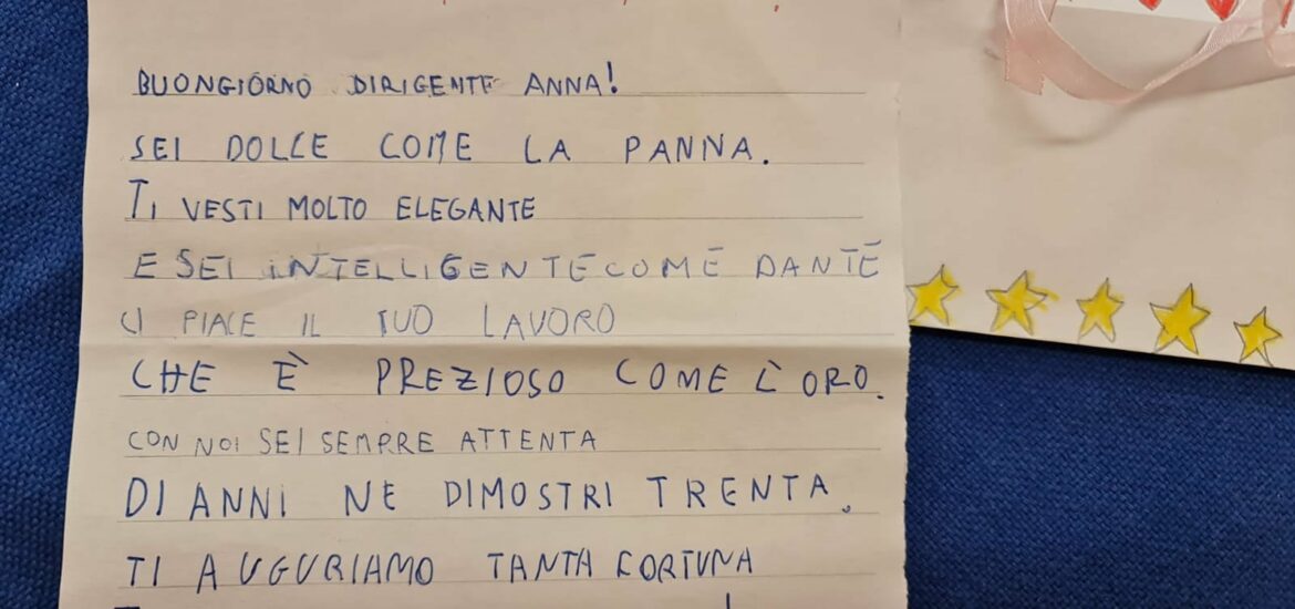 Sono le parole della dirigente scolastica di Castiglione Messer Marino, Anna Paolella, che in questi giorni ha festeggiato il compleanno. I regali e gli auguri più dolci, per la preside, sono quelli degli alunni delle classi di Castiglione che l’hanno coperta di disegni e poesie. Agli auguri si associa volentieri la redazione dell’Eco.