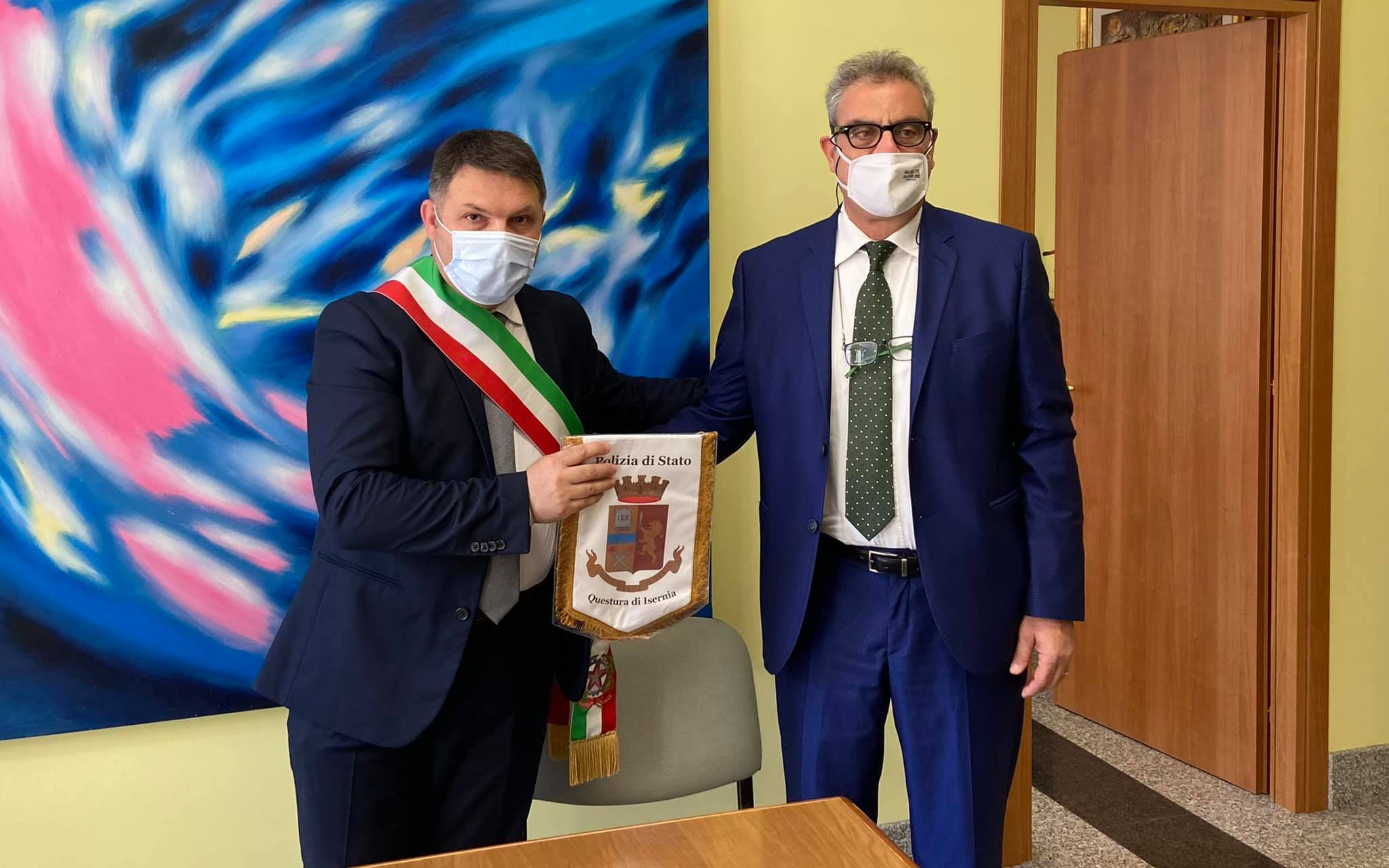 Ieri mattina il Questore di Isernia, Luciano Soricelli, insieme al Vice Questore, Maria Zoccolillo, si è recato in visita alla città di Agnone. Il Questore è stato accolto presso la sede comunale alla presenza del Generale Sergio Testini, del Capo distaccamento della Polizia Stradale, Raffaele Di Niro e del comandante della stazione Carabinieri di Agnone luogotenente Francesco Leomanni. Durante l’incontro, spiegano dal Municipio, si è discusso in merito alla gestione dei futuri eventi che avranno luogo ad Agnone. A seguito della riunione organizzativa, il Questore, insieme al Vice Questore, è stato accompagnato in una visita guidata alle attrazioni del paese: dalla Pontificia Fonderia delle Campane al Museo del Rame, dalla Biblioteca Emidiana a Palazzo San Francesco. «L’amministrazione comunale ringrazia il Questore Soricelli per la sensibilità e la disponibilità dimostrate nei confronti del nostro amato paese».