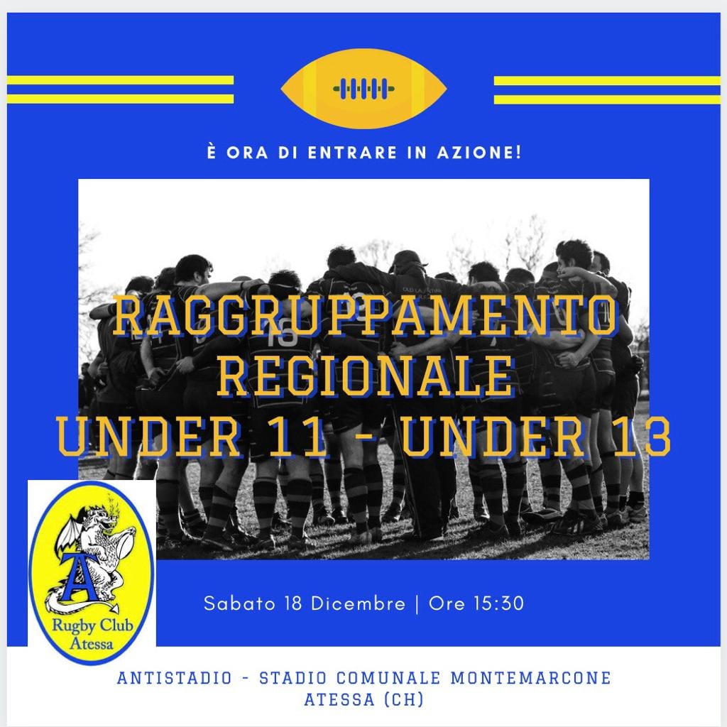 Sabato 18 dicembre, dopo due anni e mezzo di stop dovuto alla pandemia, si torna a giocare ad Atessa. I Draghetti del Rugby Club Atessa sono pronti a ripartire e incontreranno, nell’ Antistadio dello Stadio Comunale di Montemarcone – Atessa, cinque club ospiti: Sulmona Rugby (AQ), Rugby Club I Fiori del Mare di Silvi (TE), e Pescara Rugby, Rugby Rebels di Chieti e Tetras Rugby di Vasto (CH), per il raggruppamento Regionale Under 11 – Under 13. L’evento è stato fortemente voluto dal presidente della squadra di rugby, Mirko Cinalli e dalla dirigenza.