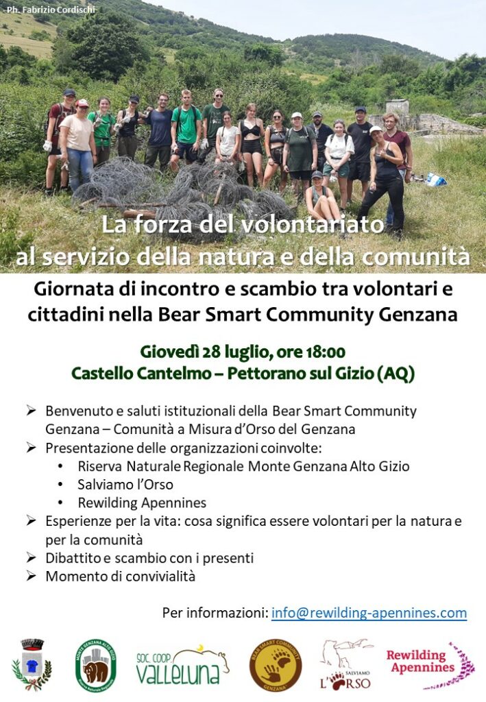 Giovedì 28 luglio 2022 alle ore 18 si terrà l’iniziativa “La forza del volontariato al servizio della natura e della comunità. Giornata di incontro e scambio tra volontari e cittadini nella Bear Smart Community Genzana” presso il Castello Cantelmo di Pettorano sul Gizio. Il programma di volontariato, che ha avuto inizio nel 2015, porta molteplici benefici, in primis ai ragazzi, che da tutta Europa fanno un’esperienza intensa a stretto contatto con la natura, imparando le pratiche rewilding, contribuendo agli sforzi per la coesistenza tra i residenti e la fauna selvatica e costruendo una comunità giovane e dinamica che rinvigorisce quella preesistente. Inoltre, i residenti di numerosi borghi dell’Appennino centrale ricevono benefici dalla presenza e dal lavoro fortemente motivato dei volontari; basti pensare alle azioni di ripristino ambientale e di pulizia di discariche illegali oppure al montaggio e alla manutenzione dei recinti elettrificati per prevenire i conflitti uomo-orso. Un ulteriore beneficio è goduto dalle organizzazioni presso le quali i volontari prestano il proprio servizio: senza di loro non si potrebbe intervenire con costanza ed efficacia e, allo stesso tempo, coprire un territorio così vasto che abbraccia l’Abruzzo montano, l’Alto Molise e il Lazio appenninico. L’evento è organizzato da Rewilding Apennines, Salviamo l’Orso, Riserva Naturale Monte Genzana Alto Gizio, Cooperativa Valleluna e Comune di Pettorano sul Gizio.