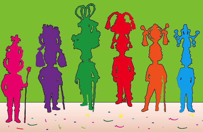 I candidi pulcinella dagli smisurati copricapi dominano la scena, organizzandone l’itinerario e le soste, effettuate dai fuguranti sia per approfittare dei rinfreschi offerti dalla popolazione che per drammatizzare brevi azioni satiriche. I pulcinella, armati di scrujazze, ossia la frusta da mandriano, indossano rumorosi campanacci e sonagliere, sono coronati da vistosi cimieri ornati da alti pennacchi e lunghi nastri di carta colorata, le zagarèlle, ma non tingono più il volto con il nero-fumo come un tempo. La sfilata viene preceduta dalla loro corsa scampanellante, mentre le soste vengono annunciate percuotendo il suolo con la frusta, usata anche per allontanare il pubblico durante le varie esibizioni sceneggiate, e saltellando passi cadenzati di zumbarèlle seguendo il ritmo dei vari suonatori aggregati alla carnevalata. Sebbene pulgènelle debba essere impersonato da uomini in età adulta, nell’edizione 1990, l’anziano capo sfilata mostrava al suo fianco il nipotino, replica miniaturizzata del suo travestimento, allo scopo di trasmettergli il ruolo che la famiglia interpreta da generazioni». Testo di Adriana Gandolfi