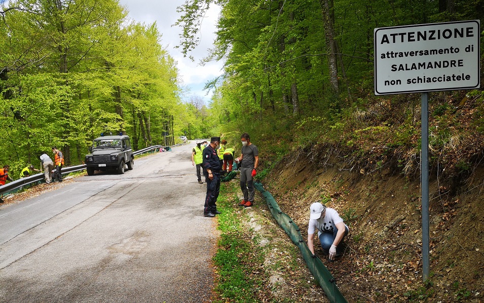 La via interessata è la provinciale 164 che collega Gamberale a Palena. La Provincia, sfruttando somme avanzate dal ribasso d’asta per lavori di manutenzione, ha realizzato, nei tratti maggiormente interessati dal passaggio degli anfibi, dei sottopassi stradali che possono essere utilizzati dalla piccola fauna per attraversare la carreggiata senza rischiare di restare schiacciata. Il problema è, ovviamente, quello di fare in modo che gli animali utilizzino soltanto quei passaggi. Qui entrano in gioco i volontari che venerdì hanno installato barriere mobili su entrambi i lati dalla provinciale sistemate in modo da convogliare gli anfibi e qualsiasi altro animaletto voglia attraversare verso i sottopassi. Impegno intenso e di gran lena dalle 10 sino al primo pomeriggio, con una breve interruzione solo per il pranzo al sacco. Risultati eccellenti, con i volontari premiati a fine giornata con una breve escursione nel bosco dove, con la esperta guida del personale del Parco, hanno incontrato numerose salamandre pezzate, salamandrine dagli occhiali, rane italiche e rane dalmatine, quasi a dimostrare, semmai ce ne fosse stato bisogno, la fondamentale importanza del lavoro svolto.