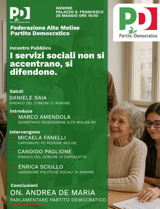 ‘I servizi sociali non si accentrano, si difendono’. E’ il titolo del convegno organizzato dalla Federazione Alto Molise del Partito democratico che si terrà lunedì 26 maggio (ore 18) a Palazzo San Francesco. Interverranno, il sindaco di Agnone, Daniele Saia, il segretario della Federazione altomolise Pd, Marco Amendola, la consigliera regionale, Micaela Fanelli, il sindaco di Capracotta, Candido Paglione, l’assessore alle Politiche sociali del Comune di Agnone, Enrica Sciullo. Le conclusioni dell’incontro affidate al parlamentare Andrea De Maria.