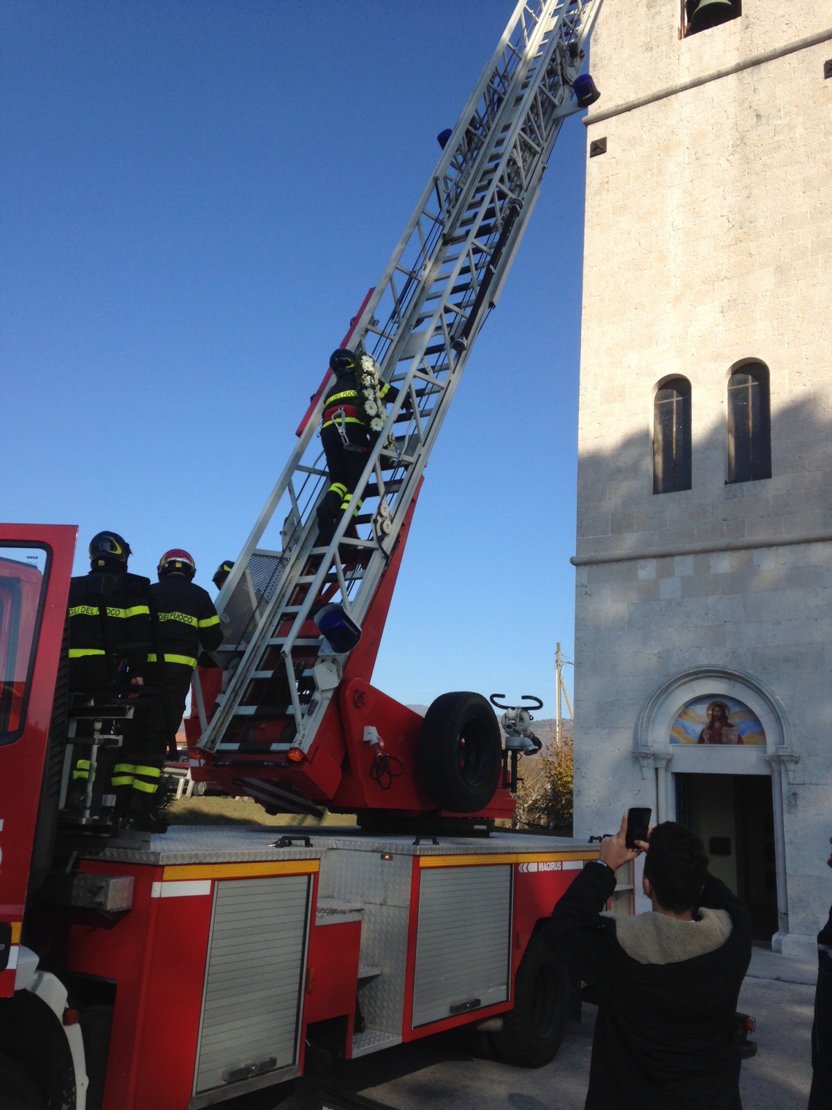 VENAFRO – Come da tradizione si è svolta la posa della corona di fiori donata dalla città di Venafro alla statua della Madonna posta sul campanile della chiesa di San Nicandro, ad opera dei Vigili del Fuoco di Isernia.